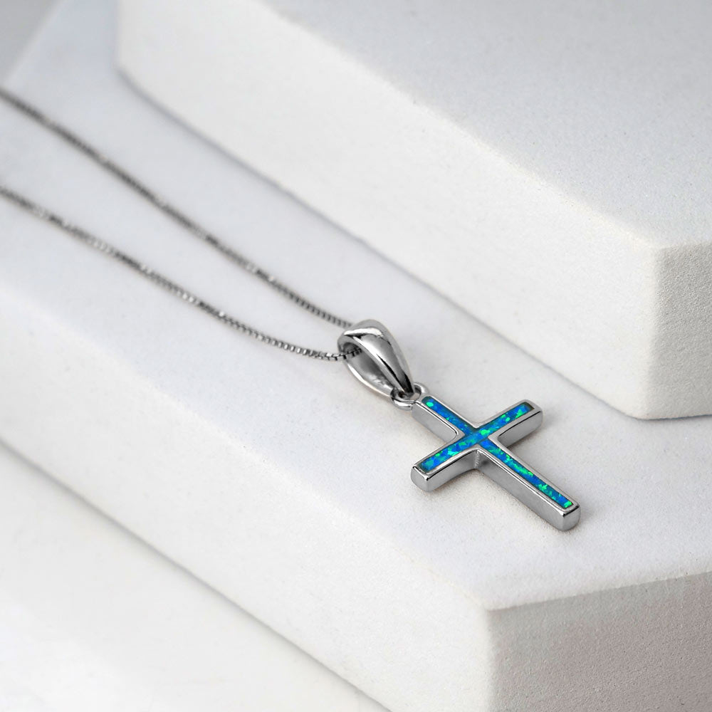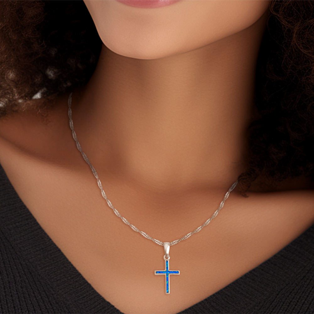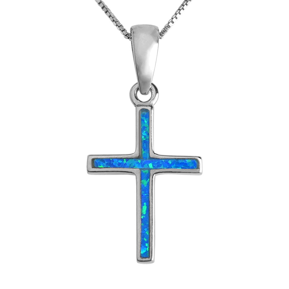 | In Depth | Sterling Silver Blue Inlay Created Opal Thin Cross Pendant. Weight: 1.62 grams. |