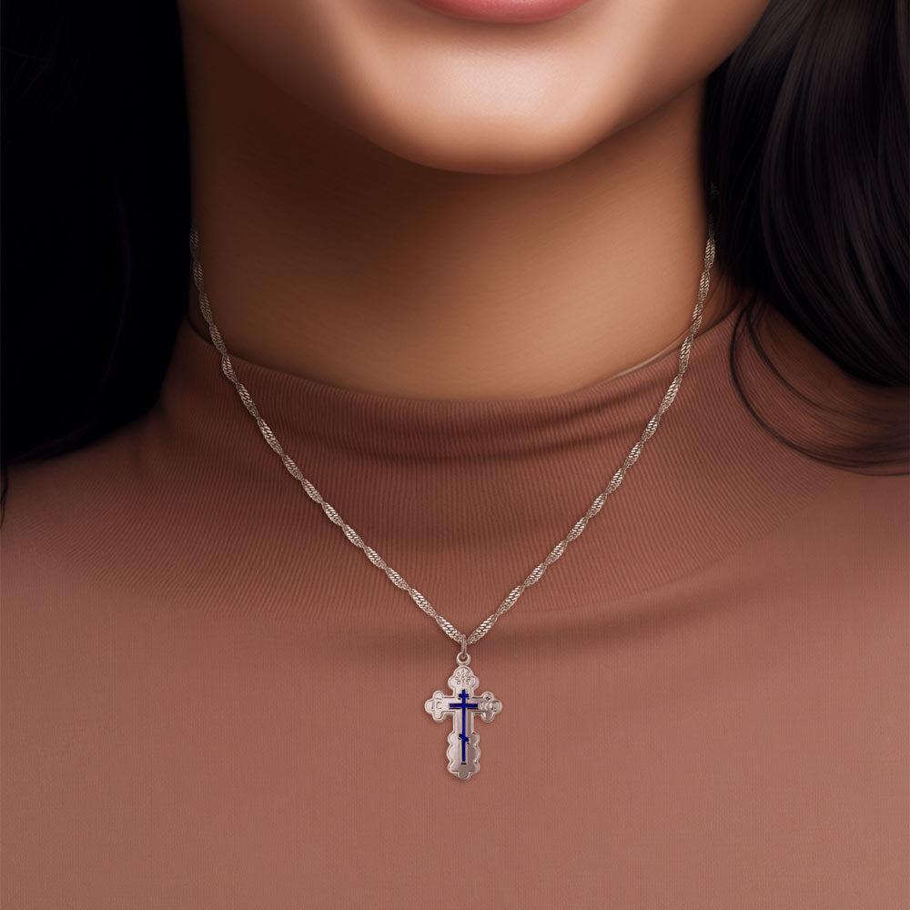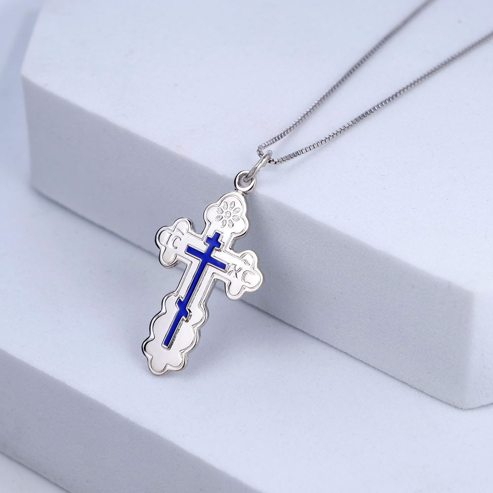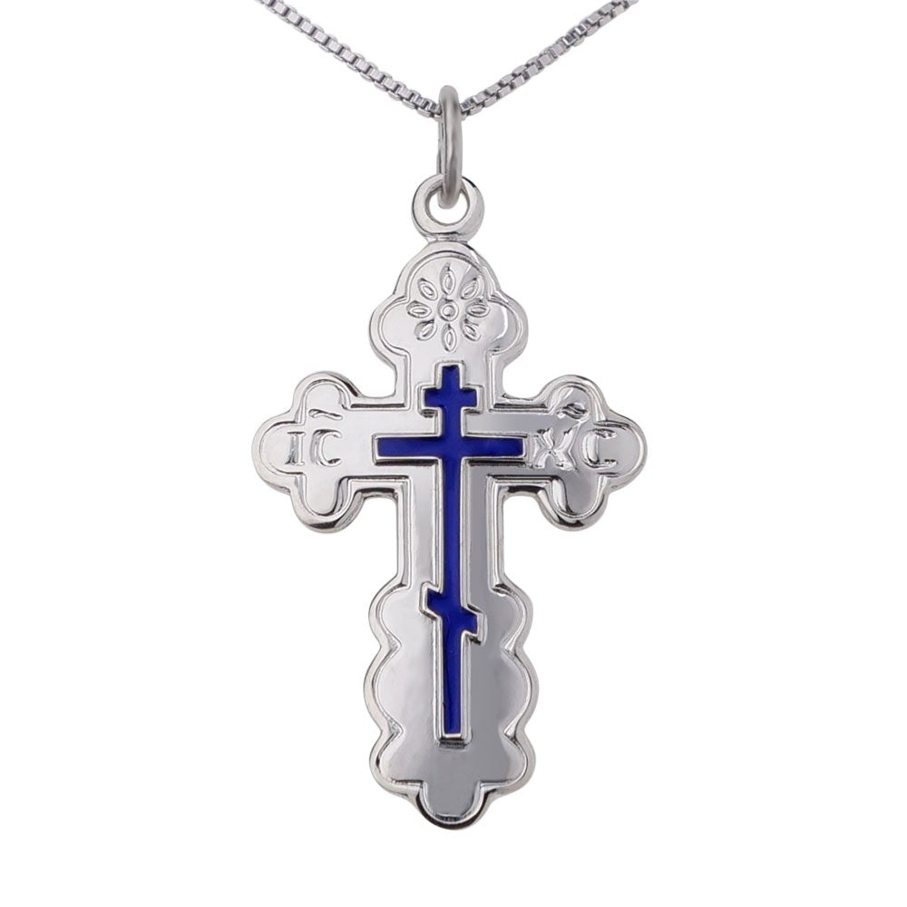 Sterling Silver Eastern Orthodox Blue Enamel Cross Pendant