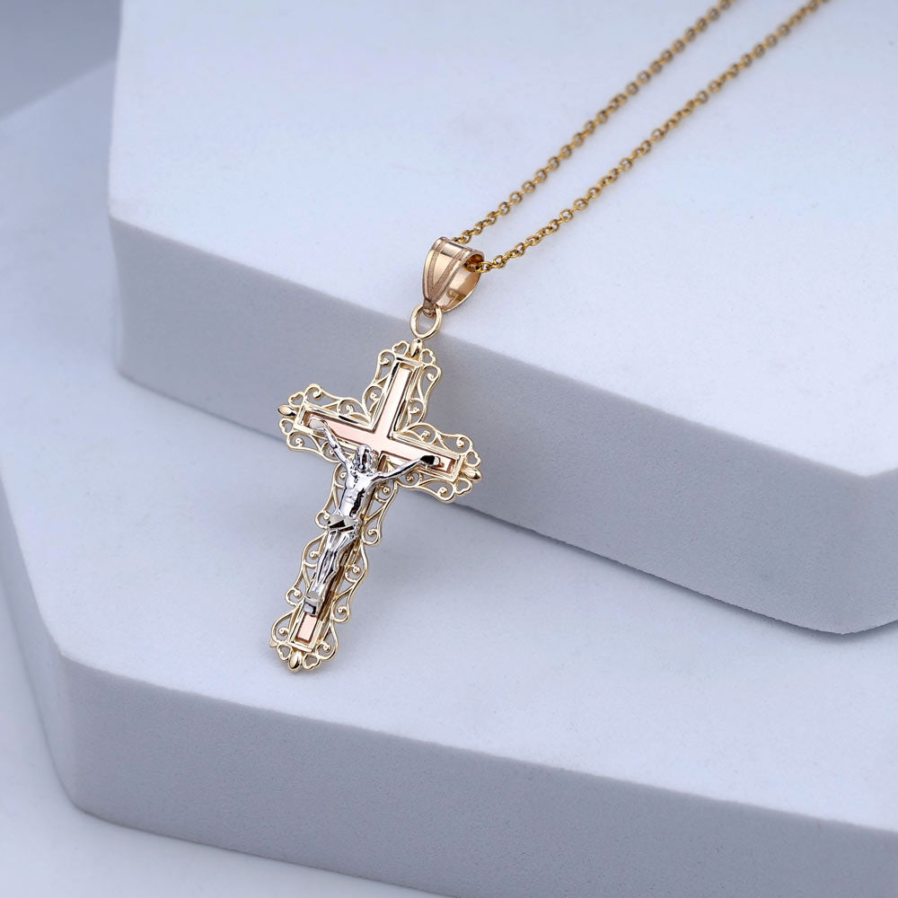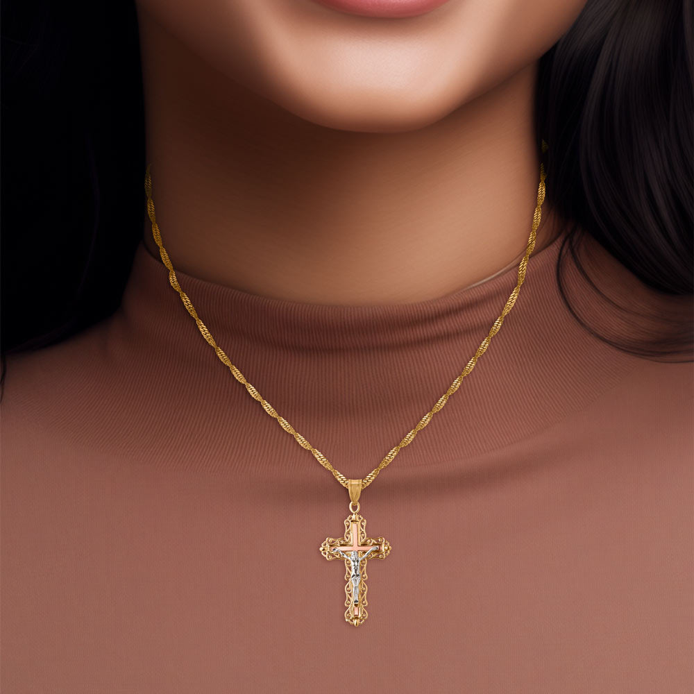 | In Depth | 14K Tri-color Diamond-cut Crucifix Pendant. Weight: 2.97 grams. |