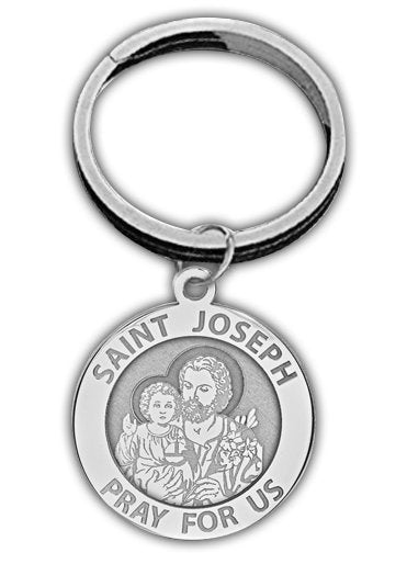 - The Saint Joseph Keychain can be engraved with a personalized message on the reverse side * Available in Sterling Silver or 14k Gold Plated. * Medal in two sizes: 1 Inch x 1 Inch (Size of a Quarter) 1-1/4 Inch x 1-1/4 Inch (Size of a Half Dollar) * Custom Sized Available Upon Request. Saint Joseph is known from the New Testament as the husband of Mary and although according to most Christian traditions he was not the biological father of Jesus of Nazareth, he acted as his foster-father and as head of the Holy Family. Joseph is venerated as a saint within the Roman Catholic, Eastern Orthodox, and Anglican churches. In the Roman Catholic and other traditions, Joseph is the patron saint of workers and has several feast days. He was also declared to be the patron saint and protector of the universal Catholic Church (along with Saint Peter) by Pope Pius IX in 1870, and is the patron of several countries and regions. He is a rare example of a saint from the early days of the church whose devotional role has tended to increase in the centuries since the Middle Ages.