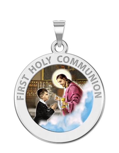 Color Laser is a patent pending process, color is guaranteed to last foreverColor Medals can be worn in the pool, shower, etc. without affecting the image. We guarantee it.The Sacrament of the Body and Blood of Jesus. This 14K Solid Gold medal celebrates receiving Jesus for the first time. This design is made specially for boy receiving communion.