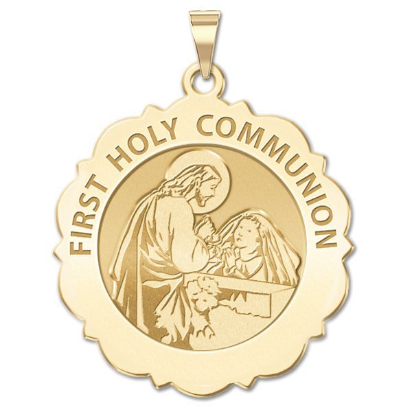 • The Sacrament of the Body and Blood of Jesus. This 14K Solid Gold medal celebrates receiving Jesus for the first time. This design is made specially for a girl receiving communion.