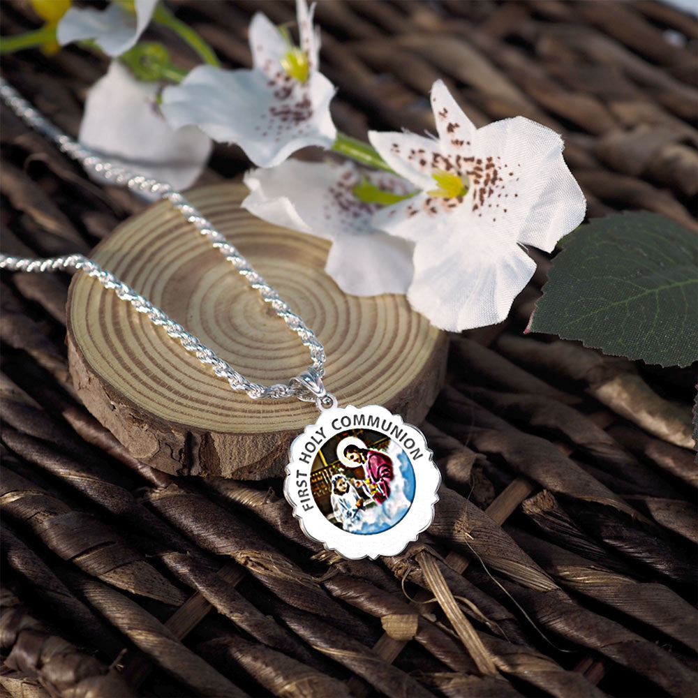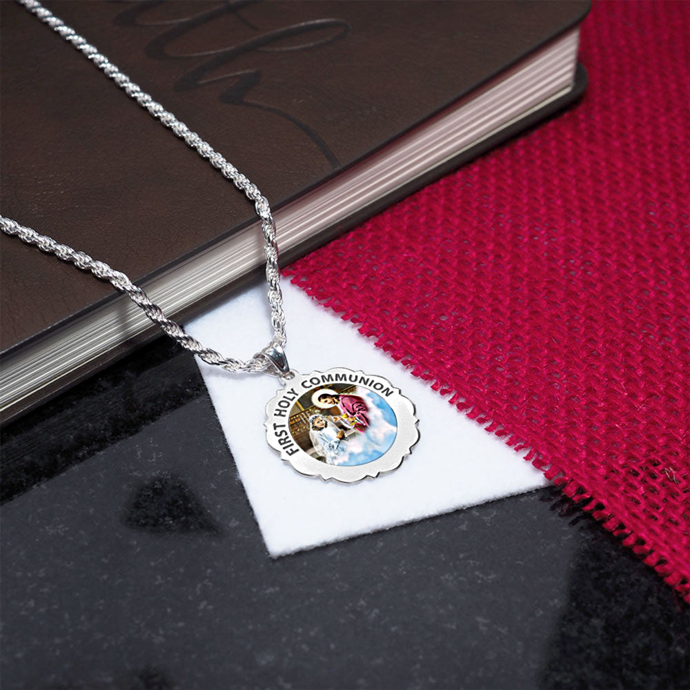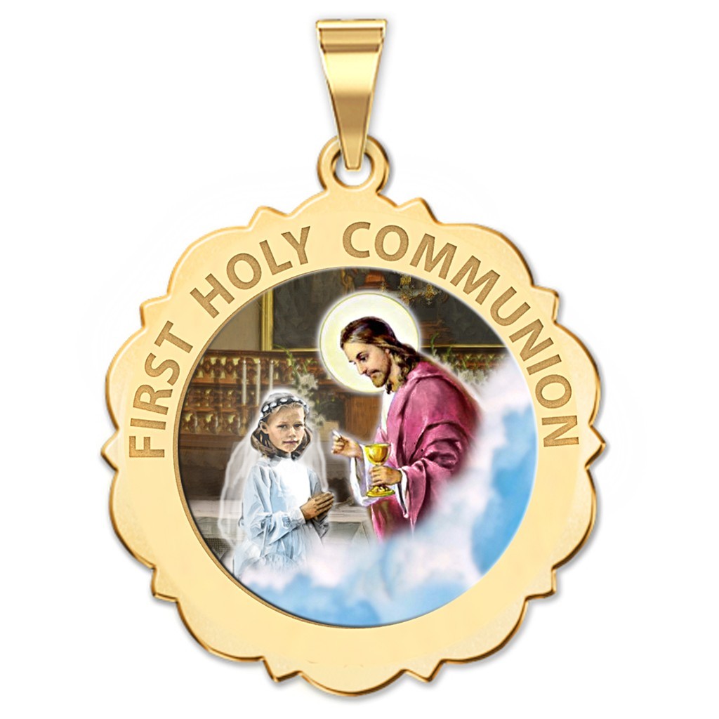 Color Laser is a patent pending process, color is guaranteed to last foreverColor Medals can be worn in the pool, shower, etc. without affecting the image. We guarantee it.The Sacrament of the Body and Blood of Jesus. This 14K Solid Gold medal celebrates receiving Jesus for the first time. This design is made specially for a girl receiving communion.