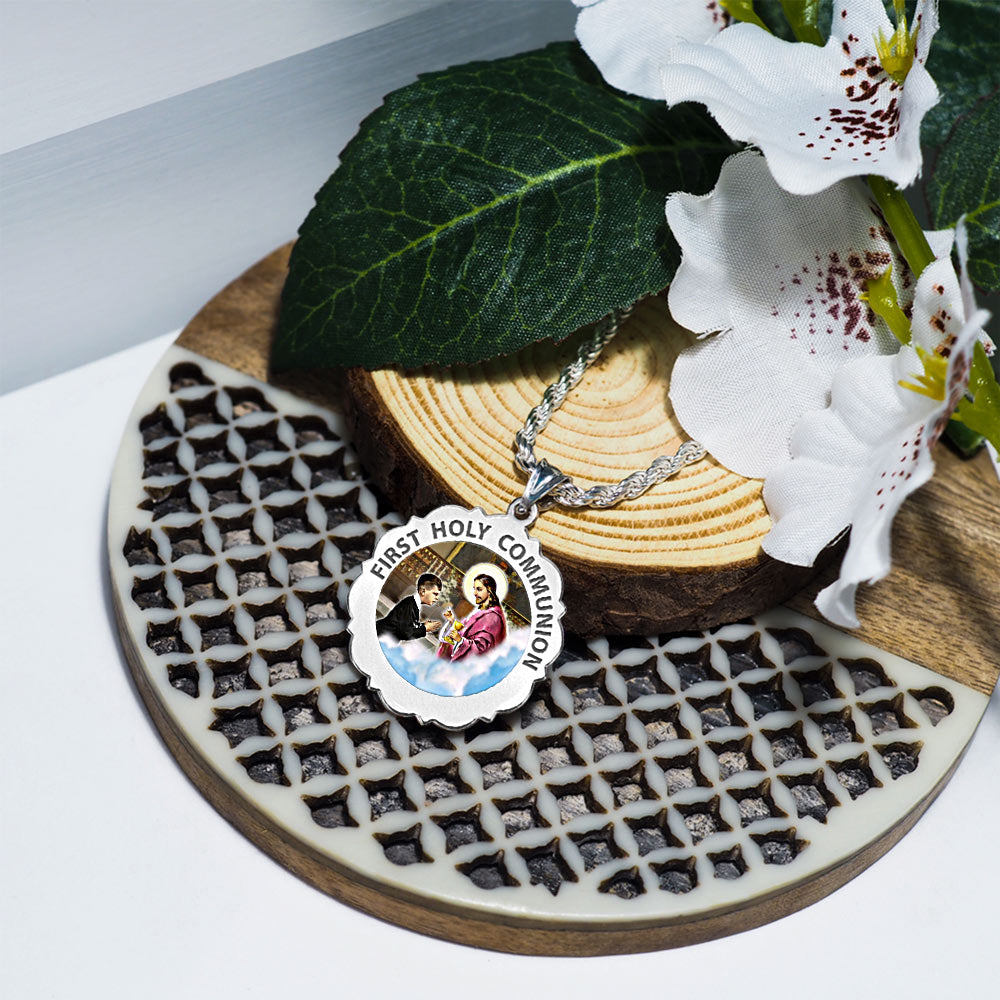 Color Laser is a patent pending process, color is guaranteed to last foreverColor Medals can be worn in the pool, shower, etc. without affecting the image. We guarantee it.The Sacrament of the Body and Blood of Jesus. This 14K Solid Gold medal celebrates receiving Jesus for the first time. This design is made specially for boy receiving communion.