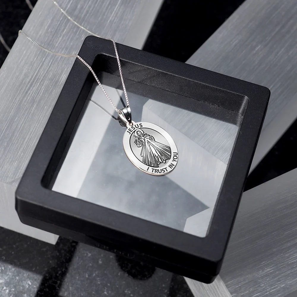 All Religious Medals are Customizable. We can change the spelling, your language, names etc, ex: change "Pray for Us" to "Pray For Me". Just let us know in "special instructions"The front of the medal features the lord Jesus Christ and the back inscribes the words "Jesus I Trust In You." The Divine Mercy is a Christian devotion focused on the mercy of God and its power, particularly as a form of thanksgiving and entrusting of oneself to God's mercy. The devotion as known today can be traced to Polish nun and canonized saint, Sister Faustyna Kowalska, known as the "Apostle of Mercy", who lived from 1905-1938. It is known that anyone who seeks God's mercy will not be turned away (Matthew 7:7). "Jesus I Trust In You" are the words inscribed on a picture that Faustina had said was to be made at the request of Jesus himself through the inner speakings of the Lord to Faustina. In 2000, Pope John Paul II officially instituted the Feast of the Divine Mercy universally for the Catholic Church on the same day that he also canonized St. Faustina.