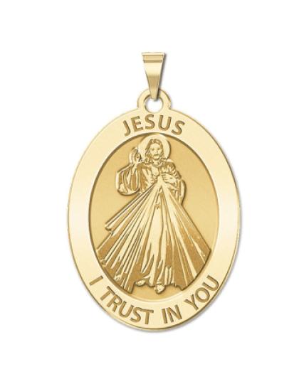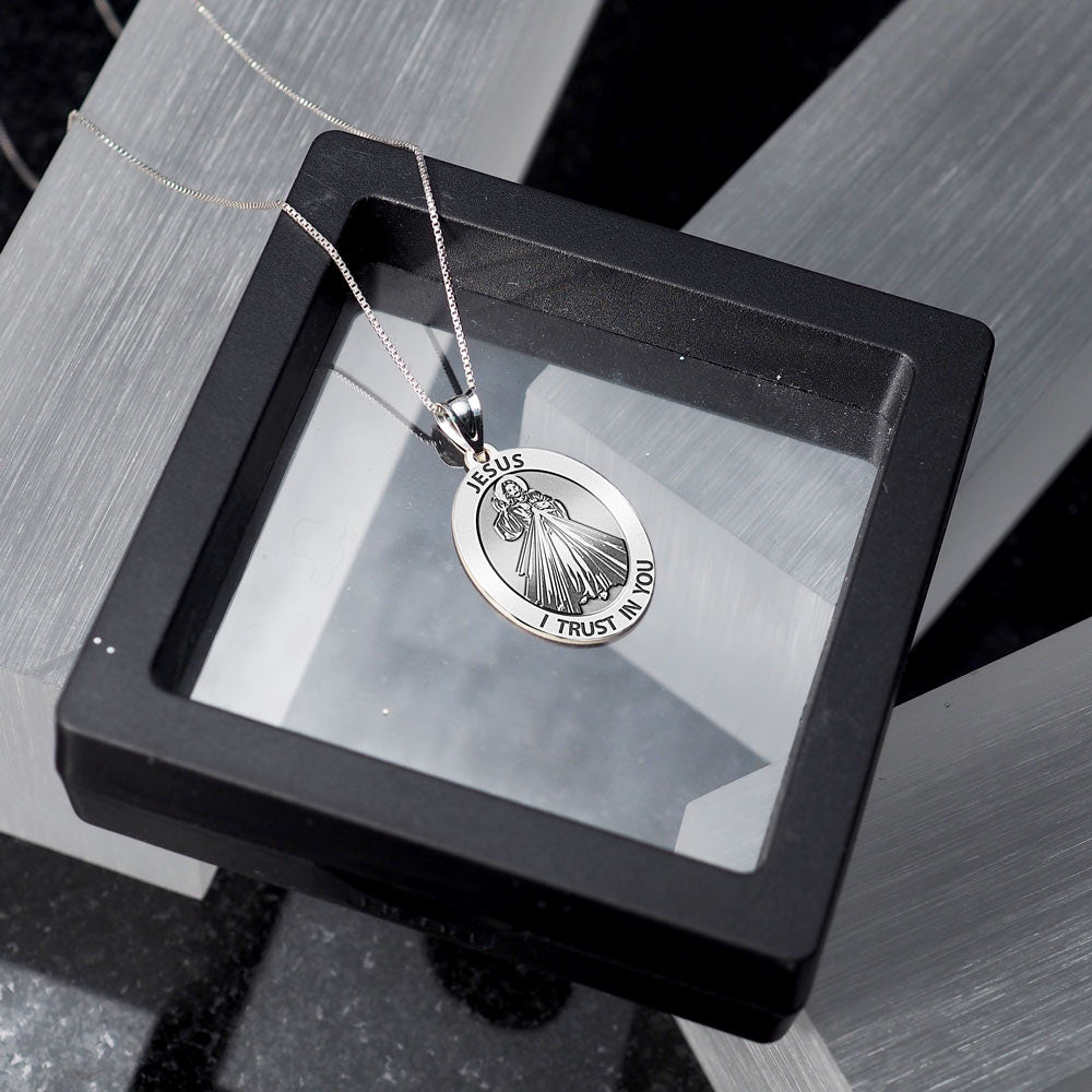 The front of the medal features the lord Jesus Christ and the back inscribes the words "Jesus I Trust In You." The Divine Mercy is a Christian devotion focused on the mercy of God and its power, particularly as a form of thanksgiving and entrusting of oneself to God's mercy. The devotion as known today can be traced to Polish nun and canonized saint, Sister Faustyna Kowalska, known as the "Apostle of Mercy", who lived from 1905-1938. It is known that anyone who seeks God's mercy will not be turned away (Matthew 7:7). "Jesus I Trust In You" are the words inscribed on a picture that Faustina had said was to be made at the request of Jesus himself through the inner speakings of the Lord to Faustina. In 2000, Pope John Paul II officially instituted the Feast of the Divine Mercy universally for the Catholic Church on the same day that he also canonized St. Faustina.