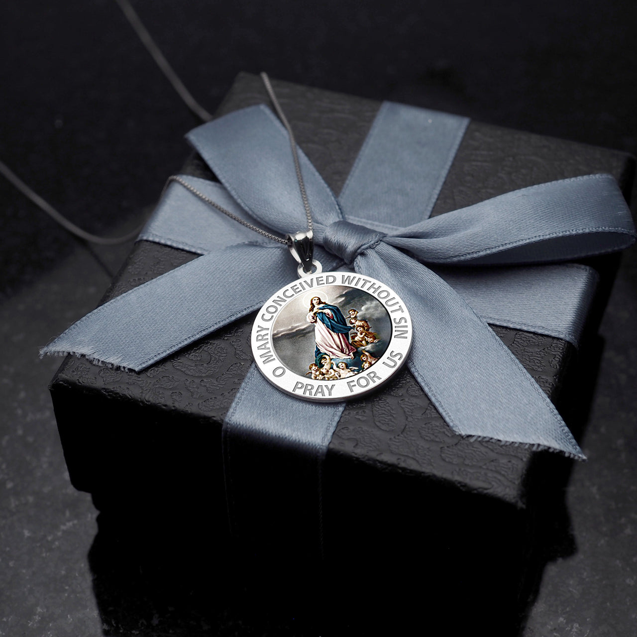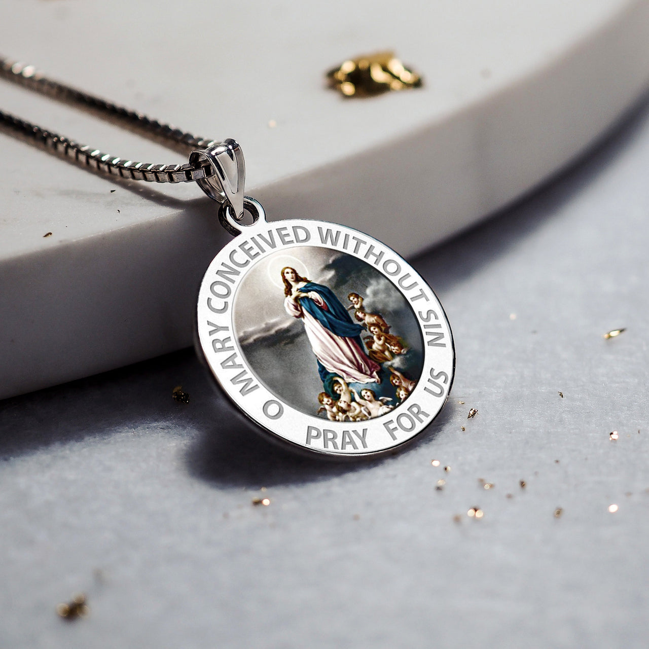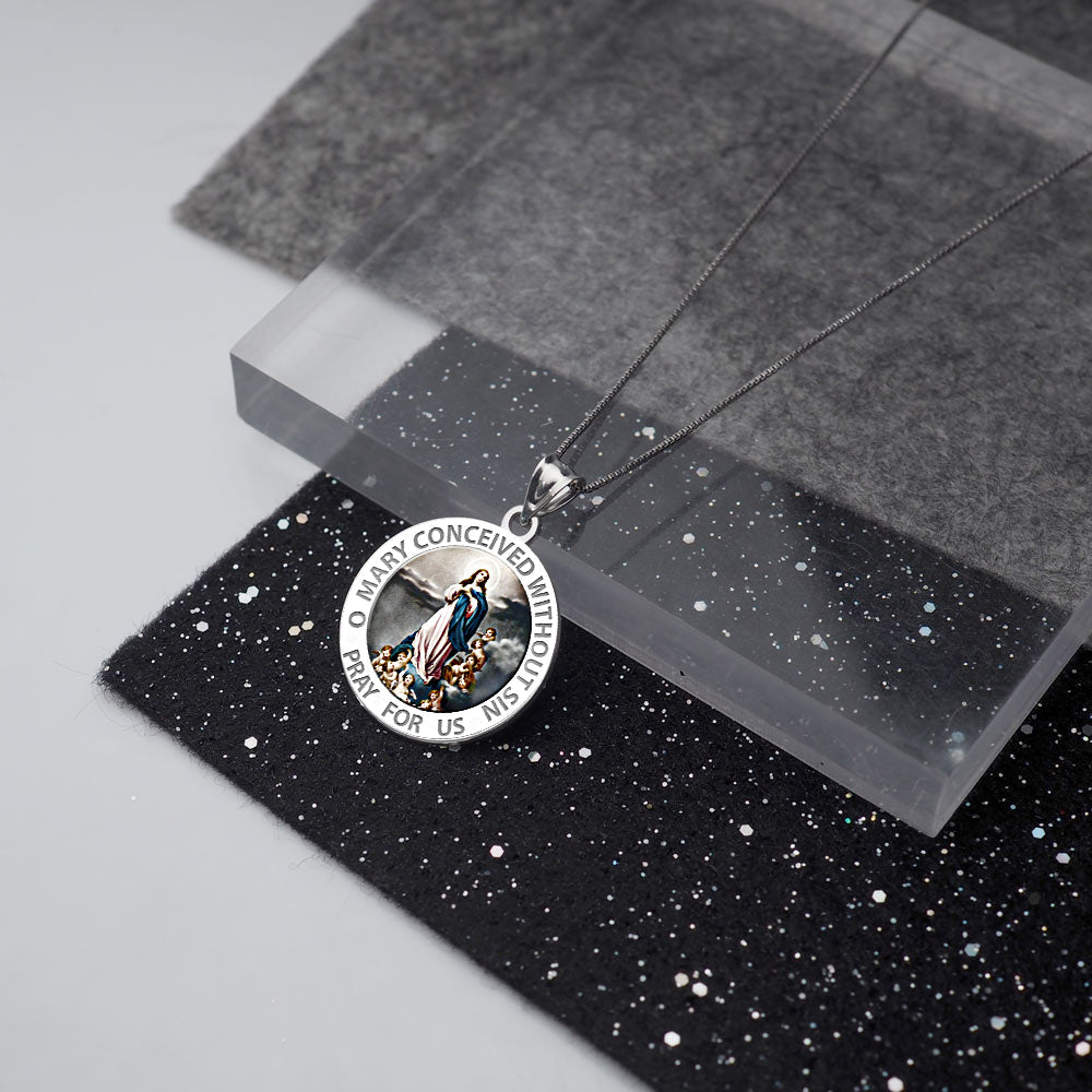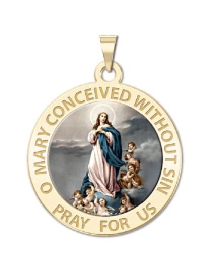 All Religious Medals are Customizable. We can change the spelling, your language, names etc, ex: change "Pray for Us" to "Pray For Me". Just let us know in "special instructions"Color Laser is a patent pending process, color is guaranteed to last foreverColor Medals can be worn in the pool, shower, etc. without affecting the image. We guarantee it.The Immaculate Conception is, according to Roman Catholic dogma, the conception of Mary, the mother of Jesus without any stain of original sin, in her mother's womb: the dogma thus says that, from the first moment of her existence, she was preserved by God from the lack of sanctifying grace that afflicts mankind, and that she was instead filled with divine grace. It is further believed that she lived a life completely free from sin. Her immaculate conception in the womb of her mother, by normal sexual intercourse (Christian tradition identifies her parents as Sts. Joachim and Anne), should not be confused with the doctrine of the virginal conception of her son Jesus. The feast of the Immaculate Conception, celebrated on December 8, was established as a universal feast in 1476 by Pope Sixtus IV. He did not define the doctrine as a dogma, thus leaving Roman Catholics freedom to believe in it or not without being accused of heresy; this freedom was reiterated by the Council of Trent. The existence of the feast was a strong indication of the Church's belief in the Immaculate Conception, even before its 19th century definition as a dogma. In the Roman Catholic Church, the Solemnity of the Immaculate Conception is a Holy Day of Obligation, except where conferences of bishops have decided, with the approval of the Holy See, not to maintain it as such. It is a public holiday in some countries where Roman Catholicism is predominant e.g. Italy. In the Philippines, alt