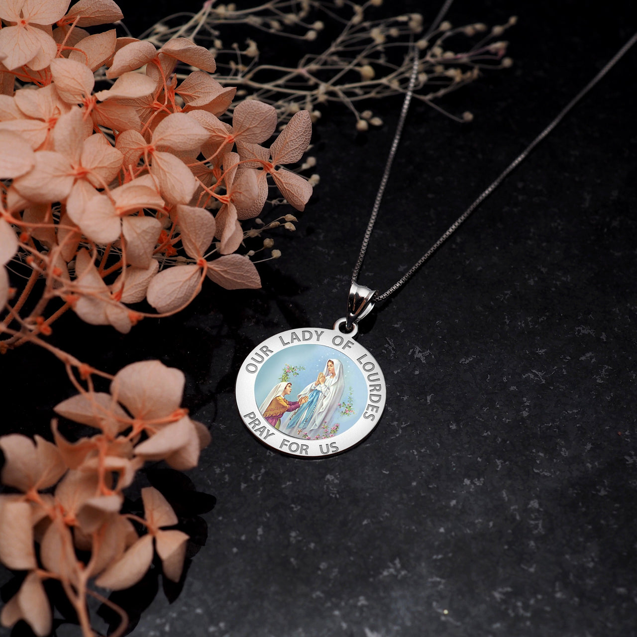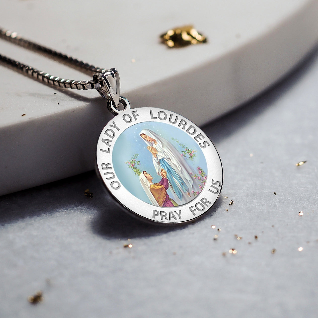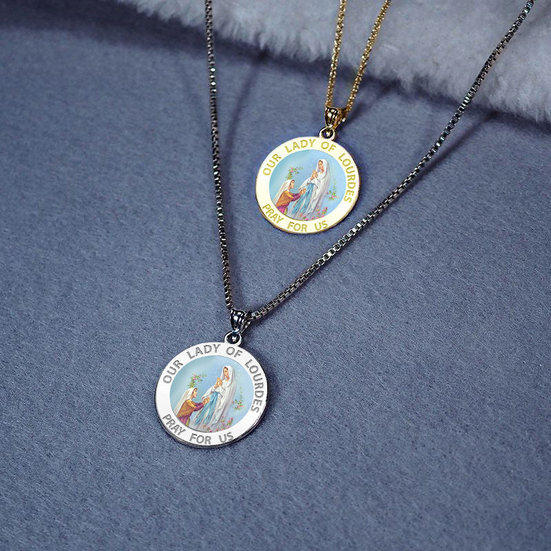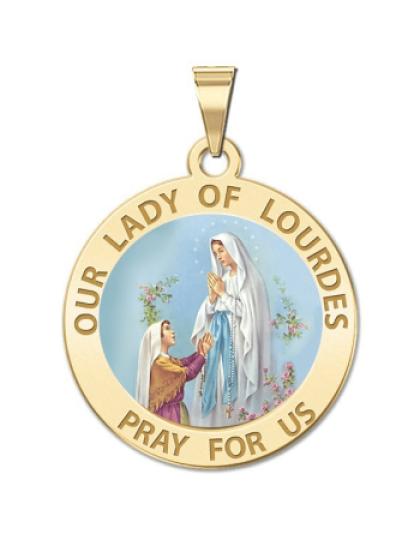 All Religious Medals are Customizable. We can change the spelling, your language, names etc, ex: change "Pray for Us" to "Pray For Me". Just let us know in "special instructions"Color Laser is a patent pending process, color is guaranteed to last foreverColor Medals can be worn in the pool, shower, etc. without affecting the image. We guarantee it.The apparitions of Our Lady of Lourdes began on 11 February 1858, when Bernadette Soubirous, a 14-year old peasant girl from Lourdes admitted, when questioned by her mother, that she had seen a "lady" in the cave of Massabielle, about a mile from the town, while she was gathering firewood with her sister and a friend. Similar appearances of the "lady" took place on seventeen further occasions that year. Catholics consider Bernadette Soubirous a saint, and many Catholics believe her visions to have been of the Virgin Mary. The first appearance of the "Lady" reported by Bernadette was on 11 February. The others were on February 14, 18-21, 23-25, 27, 28, March 1-4, 25, April 7, and July 16. Bernadette received no further apparitions after the 18th, and did not feel any desire to visit the Grotto afterwards, but the people kept on visiting. Lourdes has since grown to be the greatest Marian shrine of the Roman Catholic Church. She is the patron saint for Bodily Ills.