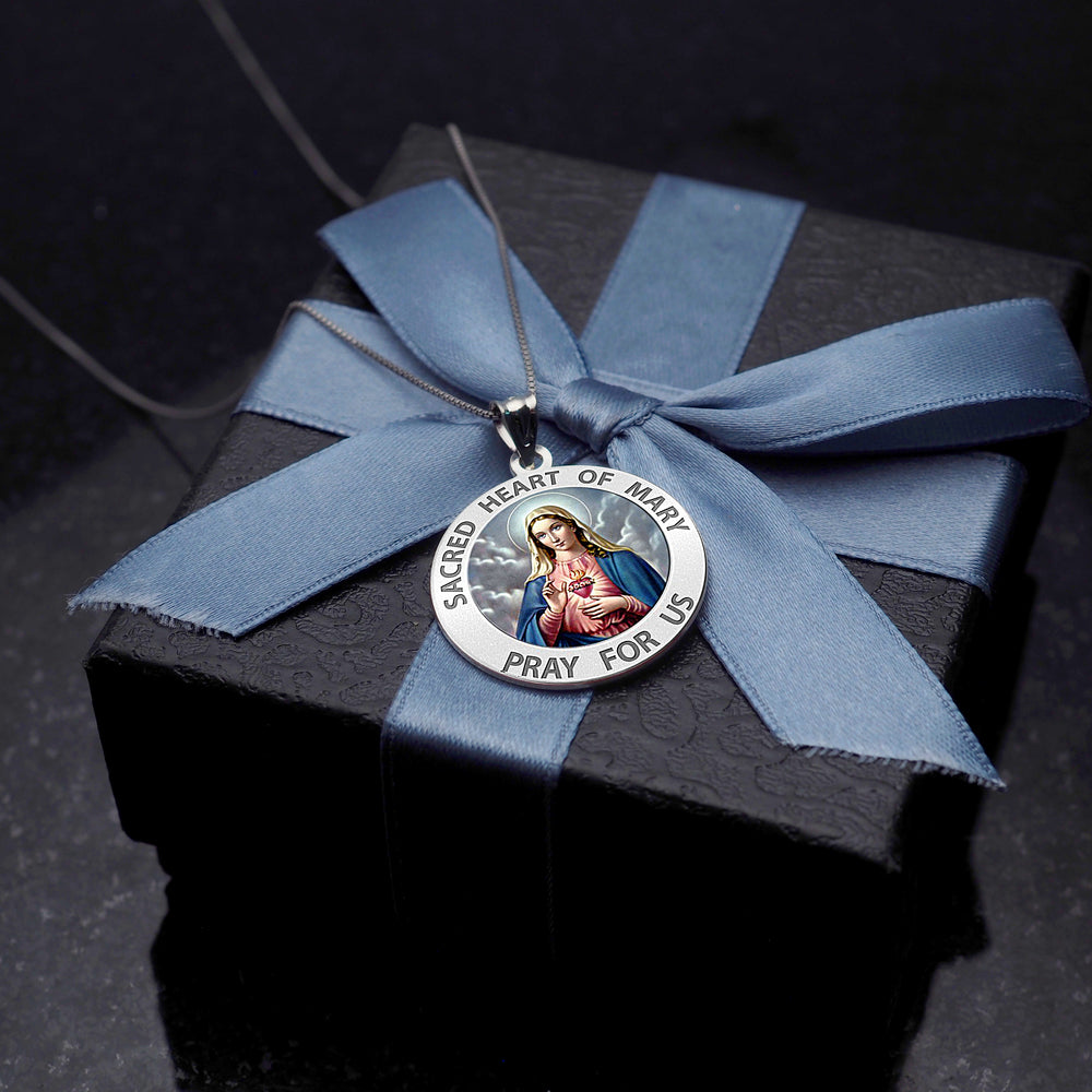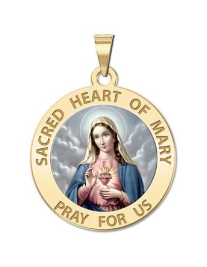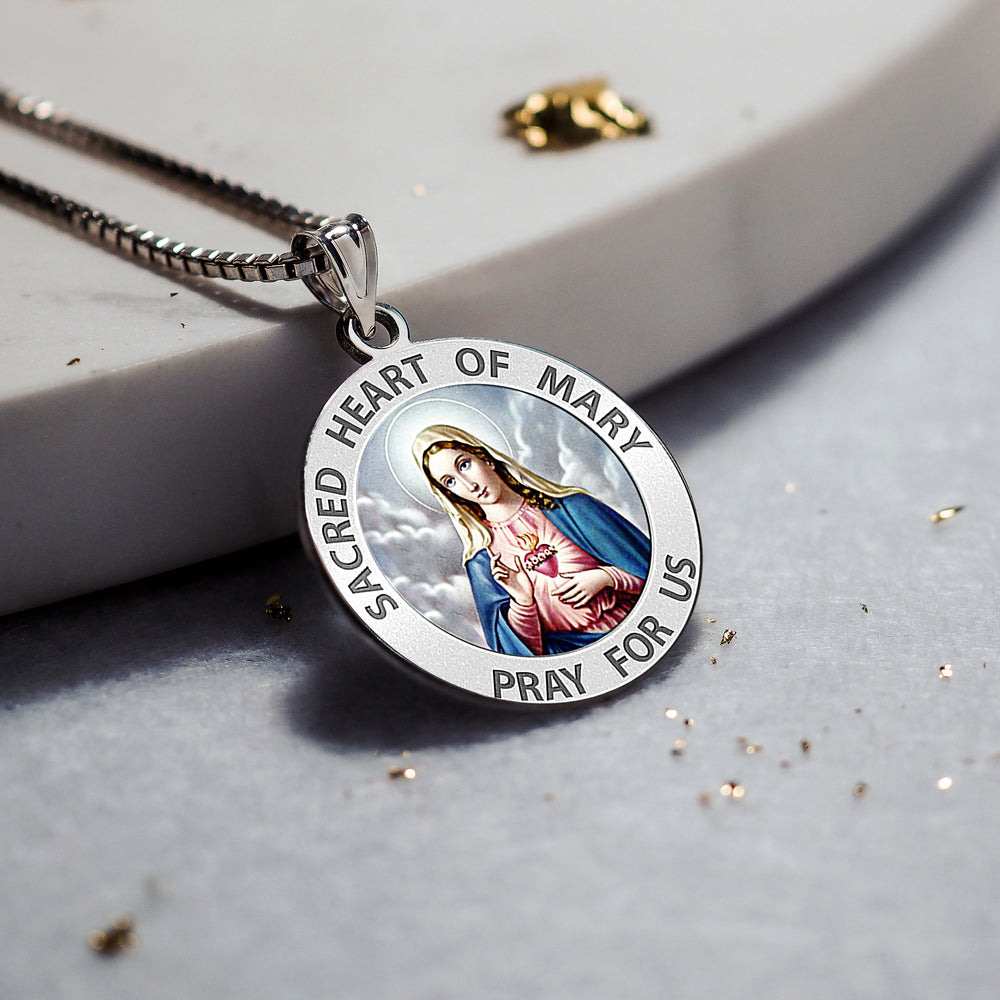 All Religious Medals are Customizable. We can change the spelling, your language, names etc, ex: change ("Pray for Us" to "Pray For Me") or ("Saced Heart of Mary" to "Immaculate Heart of Mary"). Just let us know in "special instructions"Color Laser is a patent pending process, color is guaranteed to last foreverColor Medals can be worn in the pool, shower, etc. without affecting the image. We guarantee it.he Sacred Heart of Mary is a devotional name used by Roman Catholics and some Anglicans to refer to the physical heart of Mary, the mother of Jesus as a symbol of Mary's interior life, her joys and sorrows, her virtues and hidden perfections, and, above all, her virginal love for her God, her maternal love for her Son, Jesus, and her compassionate love for all people. The consideration of Mary's interior life and the beauties of her soul, without any thought of her physical heart, does not constitute the traditional devotion; still less does it consist in the consideration of the Heart of Mary merely as a part of her virginal body. The two elements are essential to the devotion, just as, according to Roman Catholic theology, soul and body are necessary to the constitution of man. If you'd like for the medal to read "Immaculate Heart Of Mary" Please specify in the "special instructions" box we provide you.