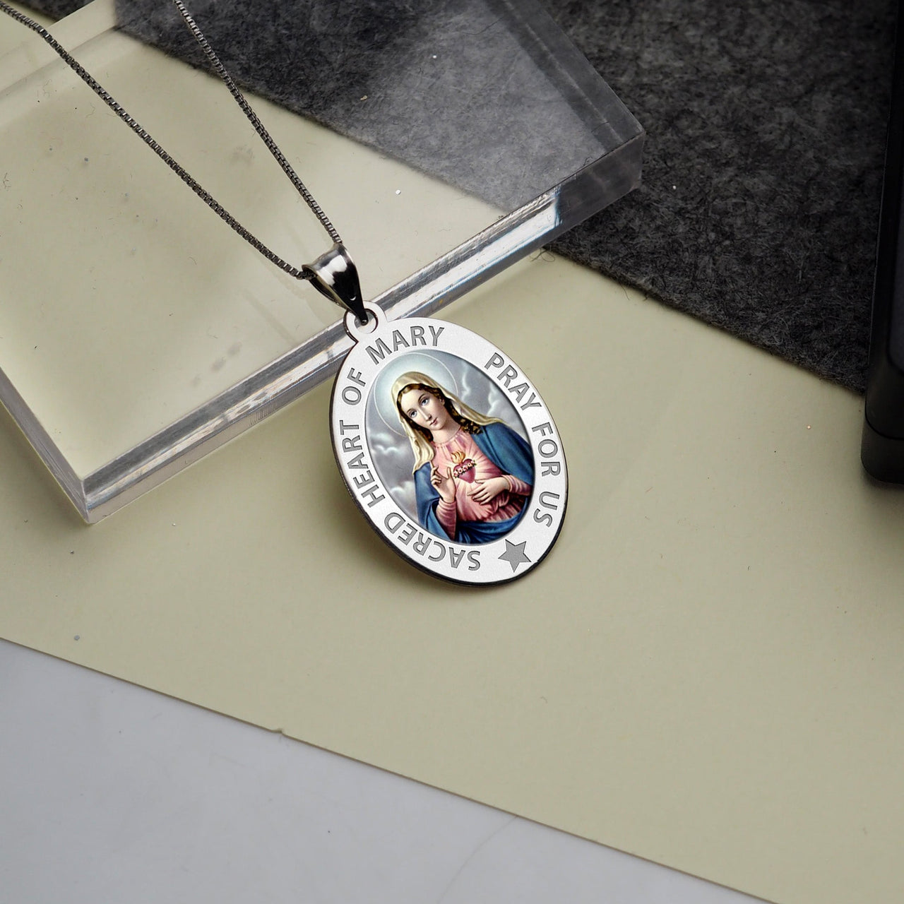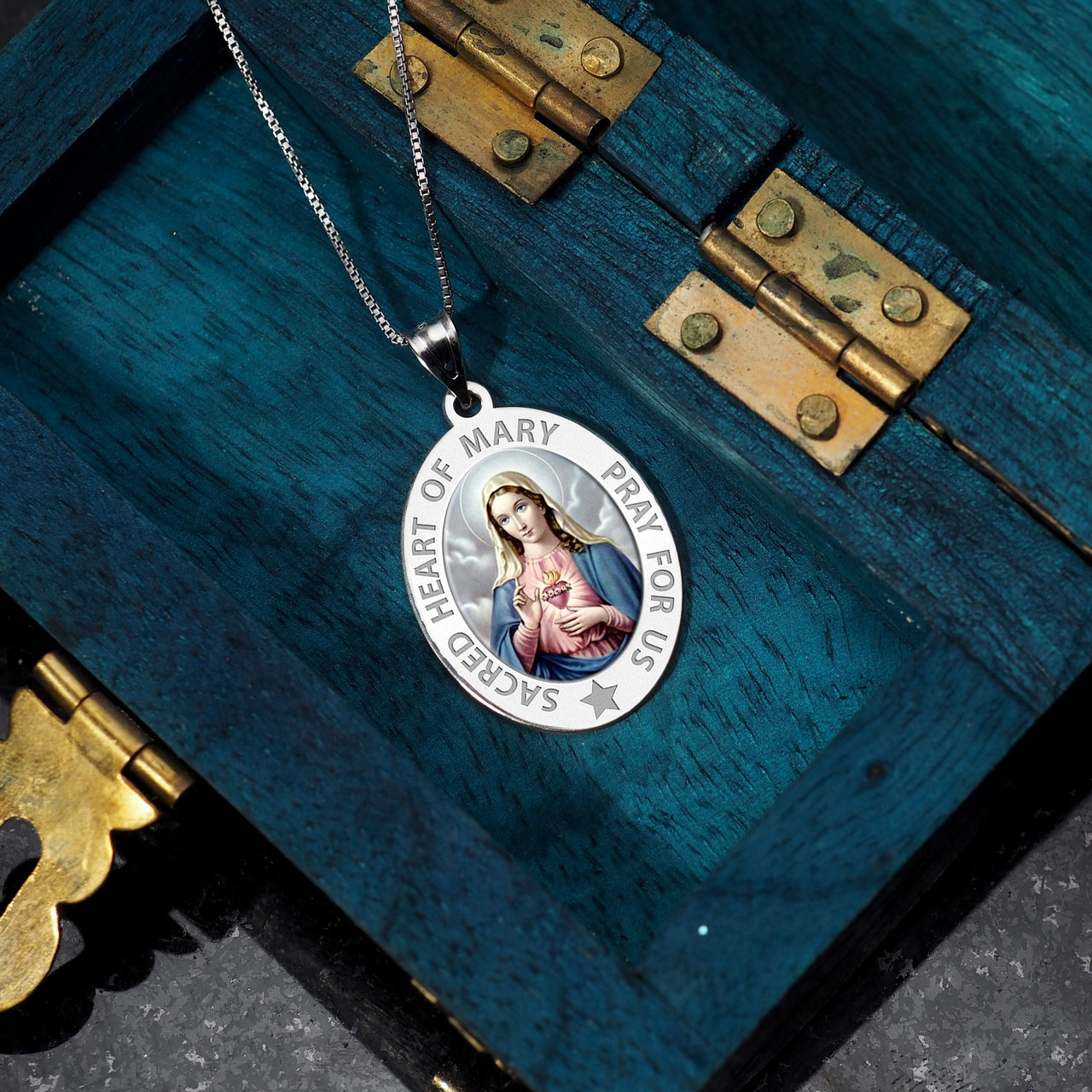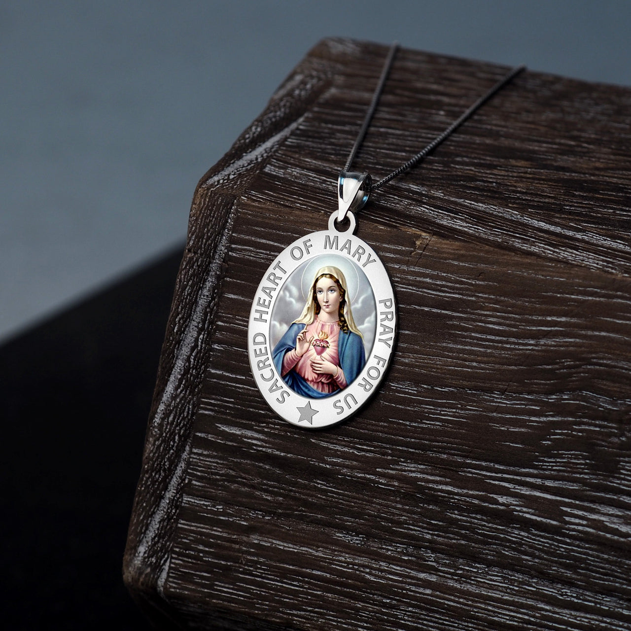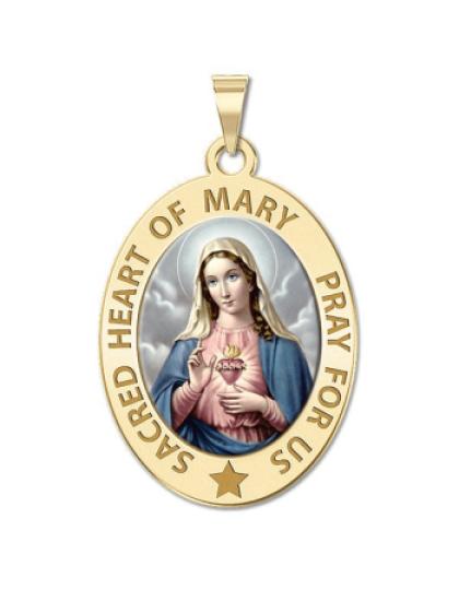 All Religious Medals are Customizable. We can change the spelling, your language, names etc, ex: change ("Pray for Us" to "Pray For Me") or ("Saced Heart of Mary" to "Immaculate Heart of Mary"). Just let us know in "special instructions"Color Laser is a patent pending process, color is guaranteed to last foreverColor Medals can be worn in the pool, shower, etc. without affecting the image. We guarantee it.The Sacred Heart of Mary is a devotional name used by Roman Catholics and some Anglicans to refer to the physical heart of Mary, the mother of Jesus as a symbol of Mary's interior life, her joys and sorrows, her virtues and hidden perfections, and, above all, her virginal love for her God, her maternal love for her Son, Jesus, and her compassionate love for all people. The consideration of Mary's interior life and the beauties of her soul, without any thought of her physical heart, does not constitute the traditional devotion; still less does it consist in the consideration of the Heart of Mary merely as a part of her virginal body. The two elements are essential to the devotion, just as, according to Roman Catholic theology, soul and body are necessary to the constitution of man. Eastern Catholics generally do not utilize the image, devotion or theology associated with the Immaculate Heart of Mary, seeing it as a form of liturgical latinization. The Roman Catholic view is based on the Roman Catholic focus on Mariology, as exemplified by Pope John Paul II's Apostolic Letter Rosarium Virginis Mariae[1] which builds on the total Marian devotion pioneered by Saint Louis de Montfort. Traditionally, the heart is pierced with seven wounds or swords, in homage to the seven dolors of Mary. Consequently, seven Hail Marys are said daily in honor of the devotion. If you'd like for the medal to read "Immacu