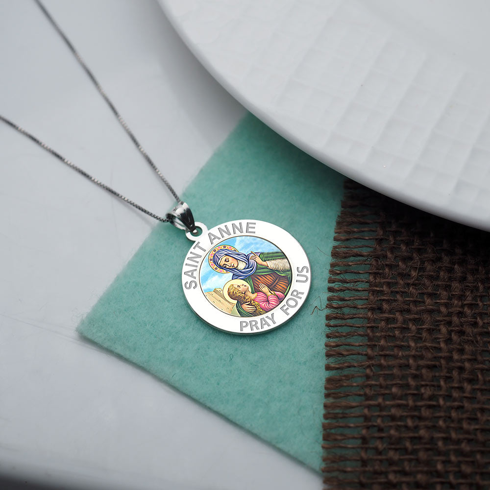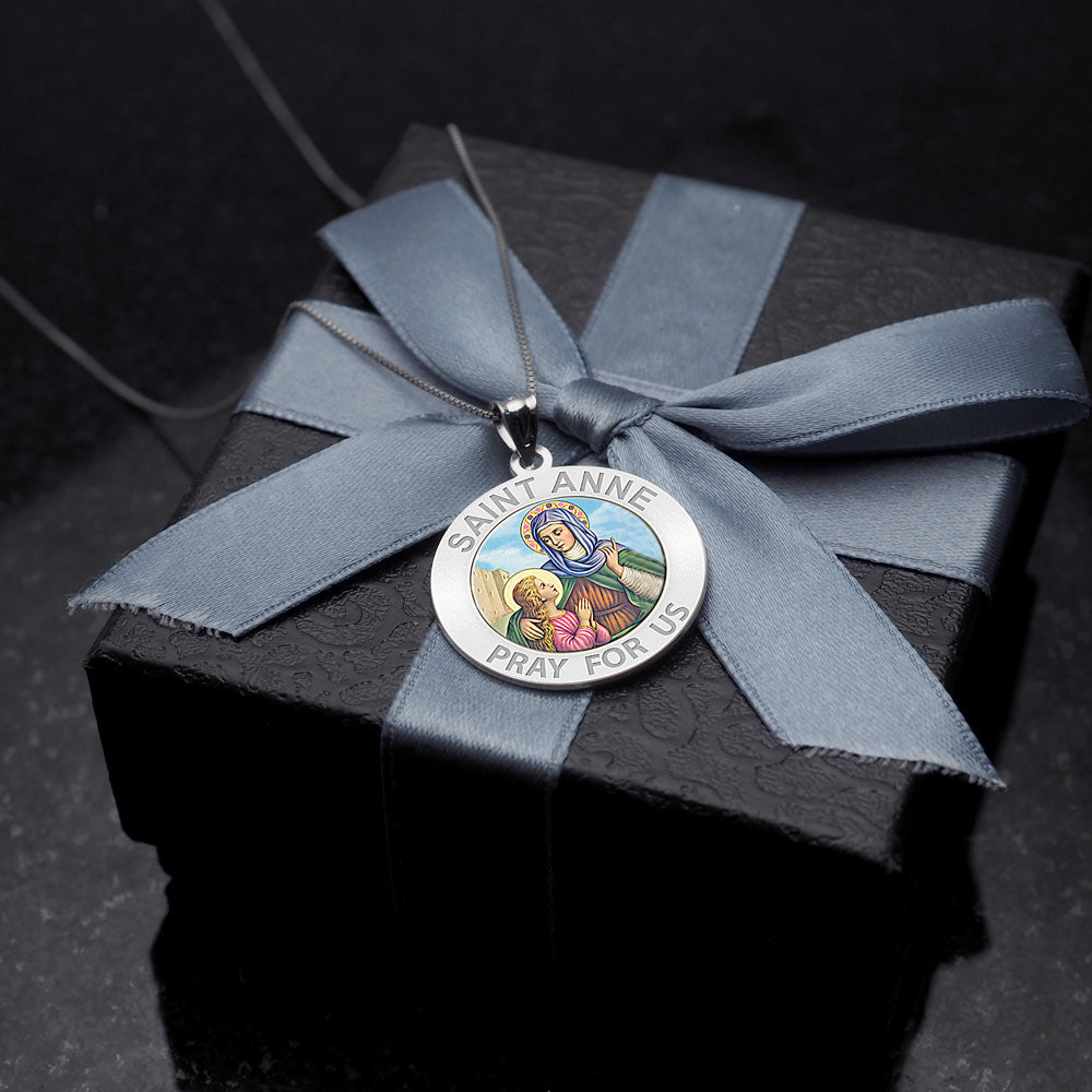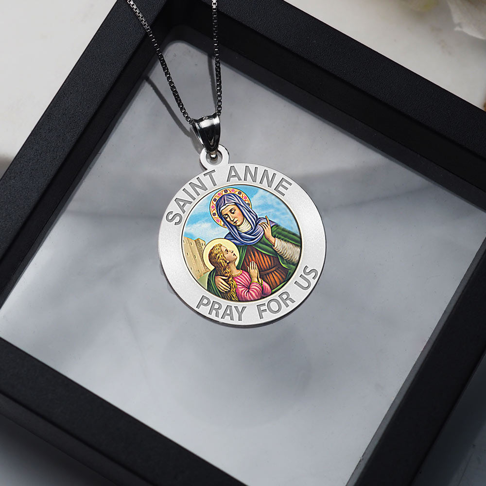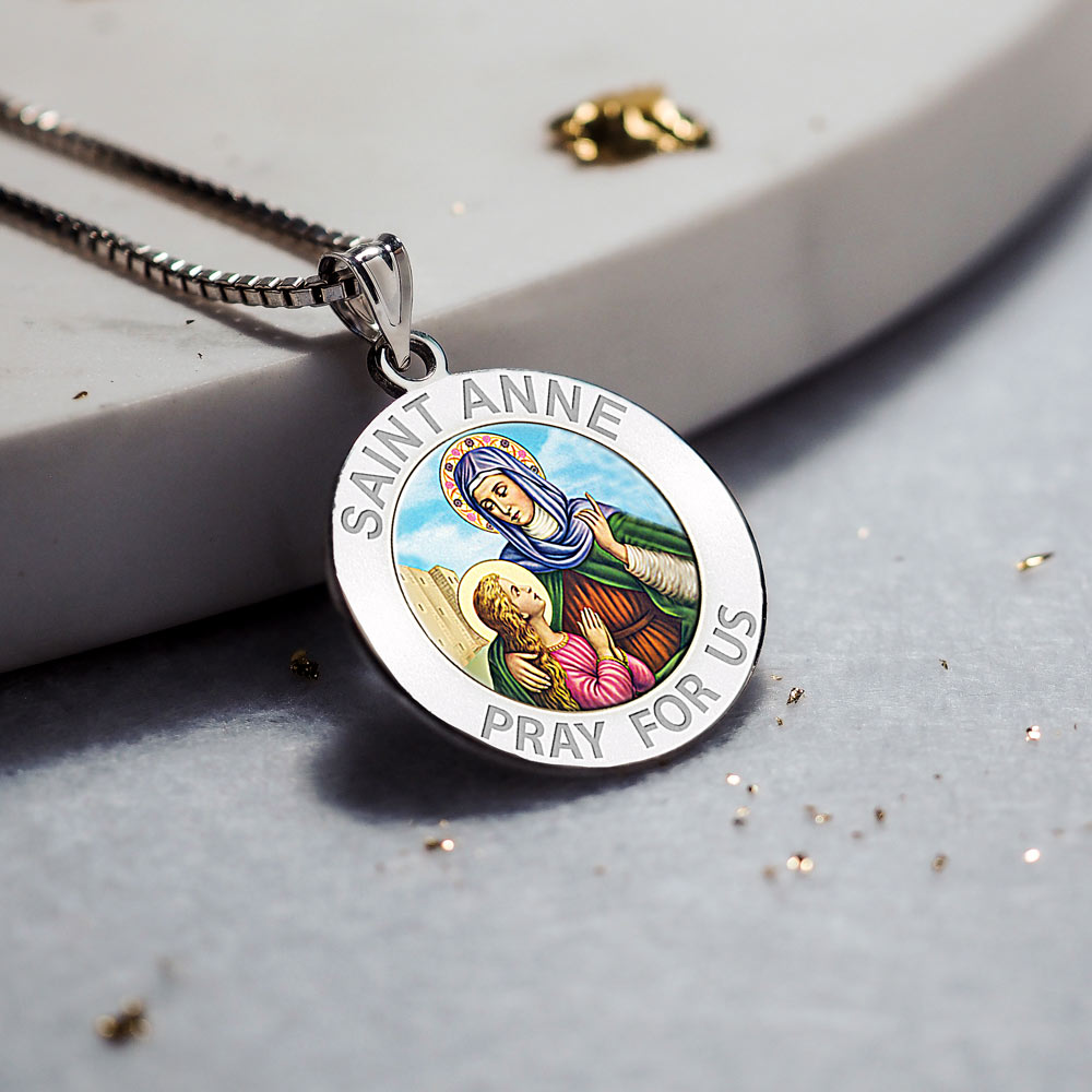 All Religious Medals are Customizable. We can change the spelling, your language, names etc, ex: change "Pray for Us" to "Pray For Me". Just let us know in "special instructions"Color Laser is a patent pending process, color is guaranteed to last foreverColor Medals can be worn in the pool, shower, etc. without affecting the image. We guarantee it.Saint Anne was the mother of the Virgin Mary. According to the non-canonical Gospel of James, Anne and her husband Joachim, after years of childlessness, were visited by an angel who told them that they would conceive a child. Anne promised to dedicate the child to God's service. Joachim and Anne are believed to have given Mary to the service of the Second Temple when the girl was three years old. Anne is a patron saint of Quebec and Brittany, and patroness of women in labor and miners.