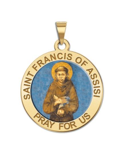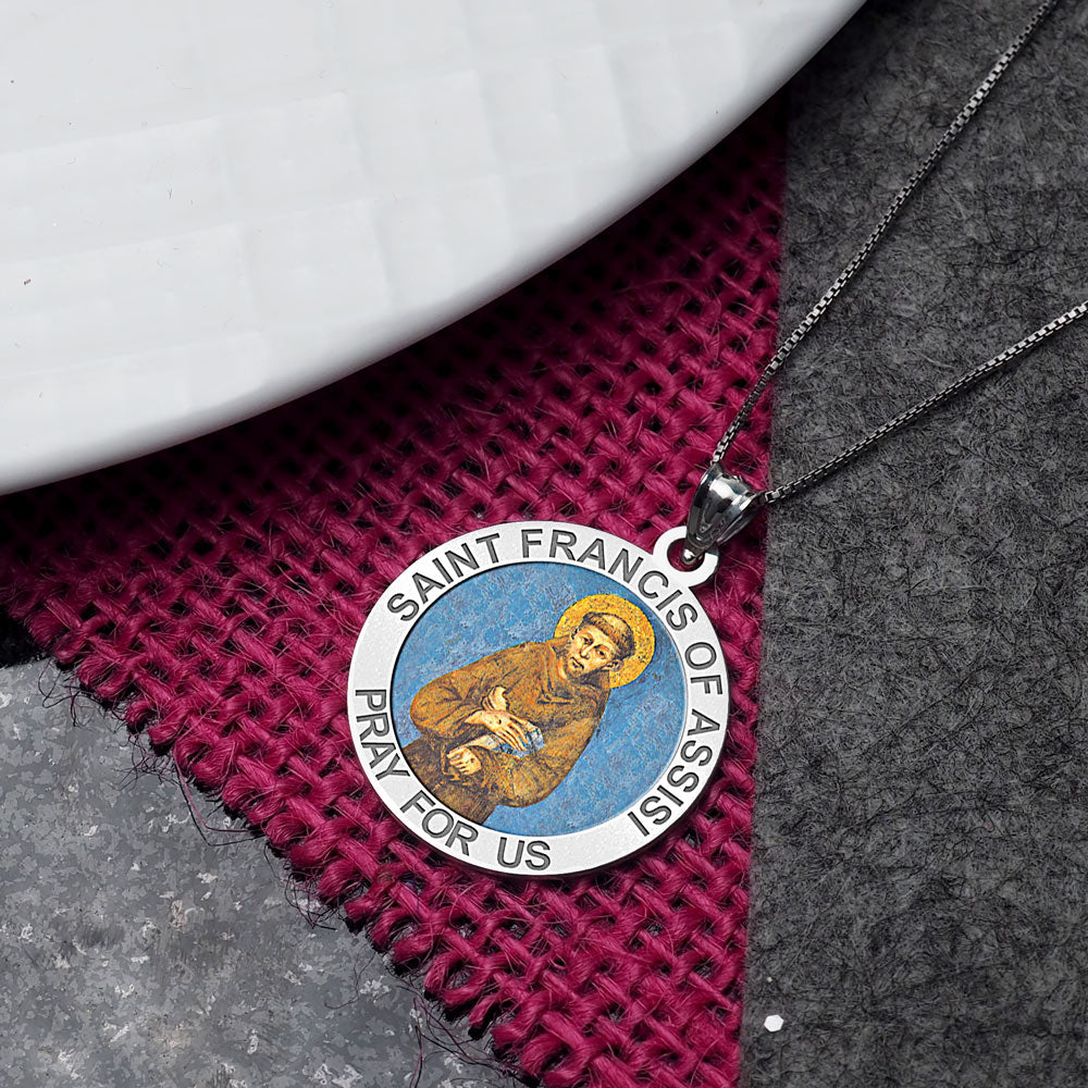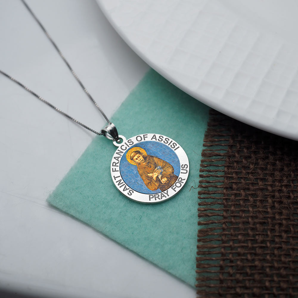 All Religious Medals are Customizable. We can change the spelling, your language, names etc, ex: change "Pray for Us" to "Pray For Me". Just let us know in "special instructions"Color Laser is a patent pending process, color is guaranteed to last foreverColor Medals can be worn in the pool, shower, etc. without affecting the image. We guarantee it.Saint Francis of Assisi (September 26, 1181 October 3, 1226) was a Roman Catholic friar and the founder of the Order of Friars Minor, more commonly known as the Franciscans. He is known as the patron saint of animals, birds, and the environment, and it is customary for Catholic churches to hold ceremonies honoring animals around his feast day of October 4. If you'd like the medal to Say "Pray For Me" or "Protector Of Animals" simply let us know in the special instructions box we provide you upon ordering.