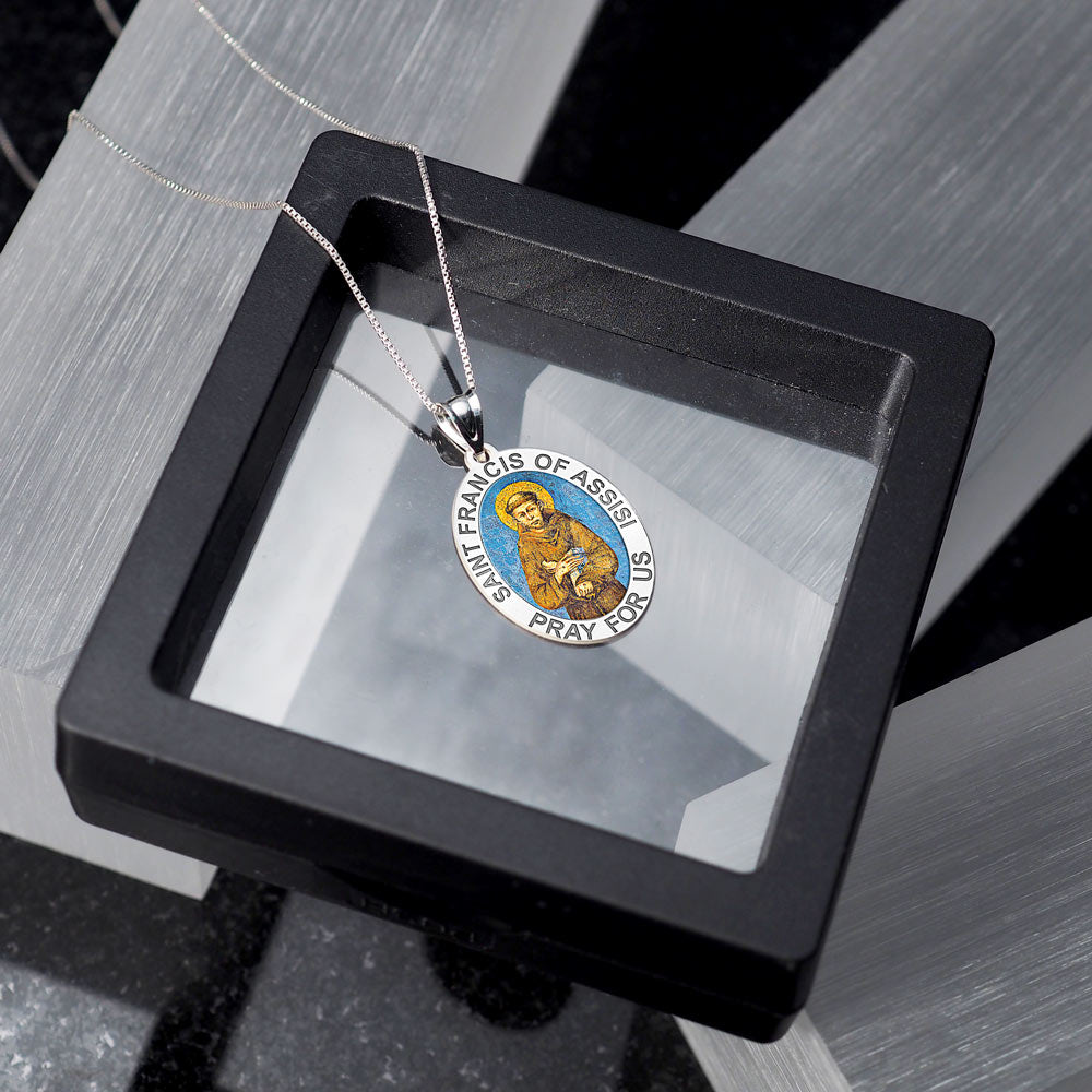 All Religious Medals are Customizable. We can change the spelling, your language, names etc, ex: change "Pray for Us" to "Pray For Me". Just let us know in "special instructions"Color Laser is a patent pending process, color is guaranteed to last foreverColor Medals can be worn in the pool, shower, etc. without affecting the image. We guarantee it.Saint Francis of Assisi (September 26, 1181 October 3, 1226) was a Roman Catholic friar and the founder of the Order of Friars Minor, more commonly known as the Franciscans. He is known as the patron saint of animals, birds, and the environment, and it is customary for Catholic churches to hold ceremonies honoring animals around his feast day of October 4. If you'd like the medal to Say "Pray For Me" or "Protector Of Animals" simply let us know in the special instructions box we provide you upon ordering.