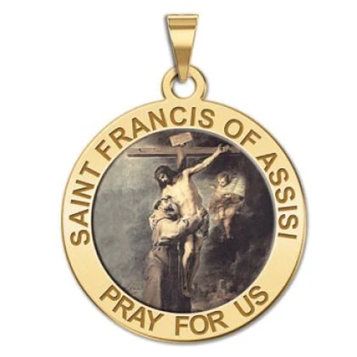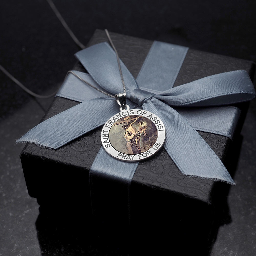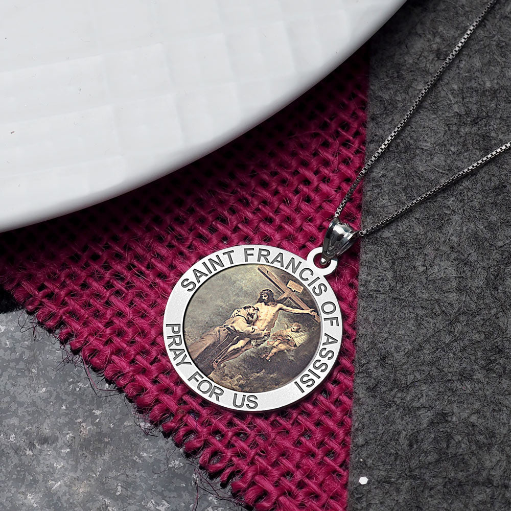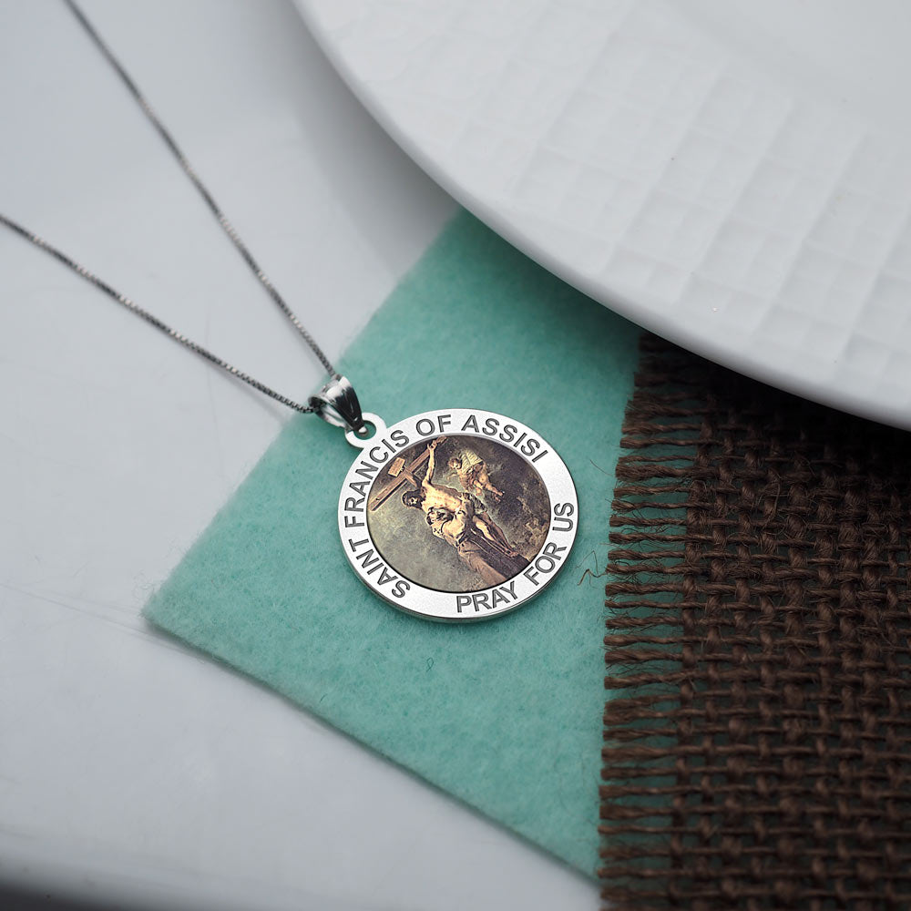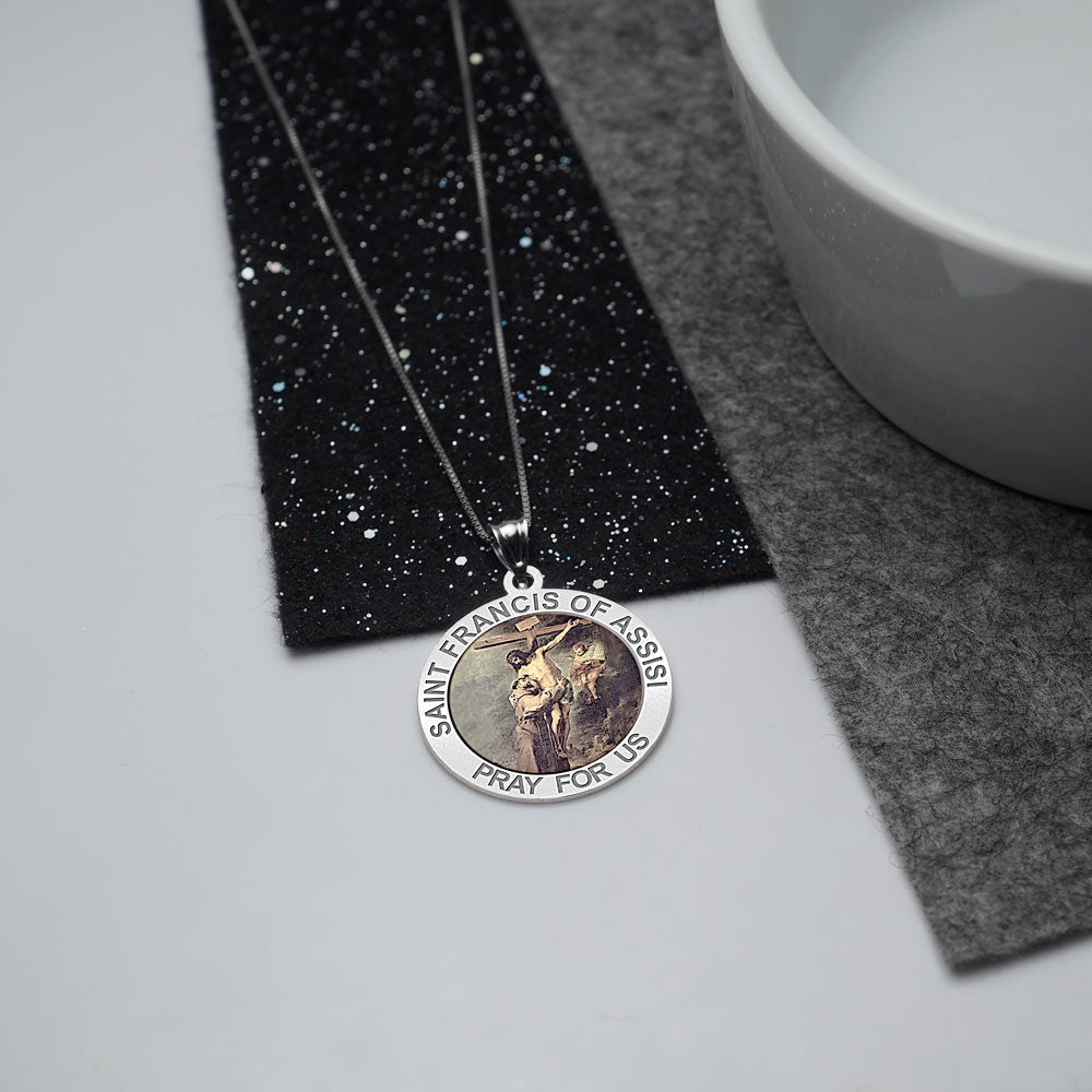 All Religious Medals are Customizable. We can change the spelling, your language, names etc, ex: change "Pray for Us" to "Pray For Me". Just let us know in "special instructions"Color Laser is a patent pending process, color is guaranteed to last foreverColor Medals can be worn in the pool, shower, etc. without affecting the image. We guarantee it.Saint Francis of Assisi (September 26, 1181 October 3, 1226) was a Roman Catholic friar and the founder of the Order of Friars Minor, more commonly known as the Franciscans. He is known as the patron saint of animals, birds, and the environment, and it is customary for Catholic churches to hold ceremonies honoring animals around his feast day of October 4.