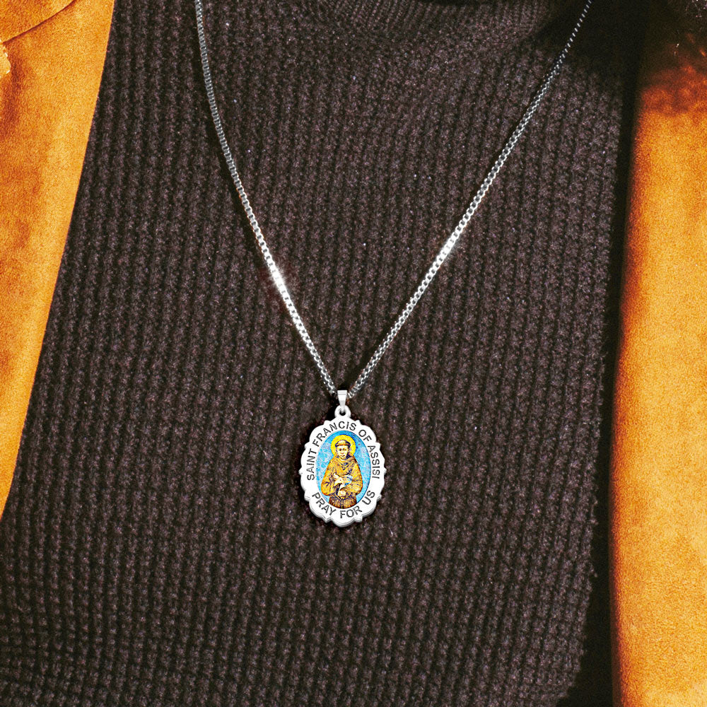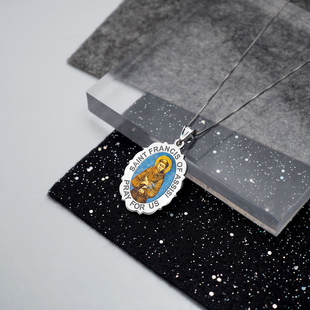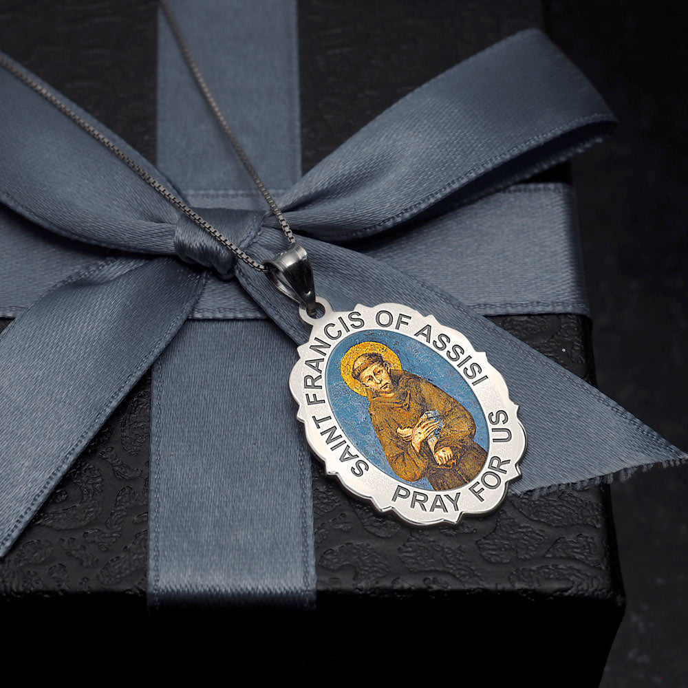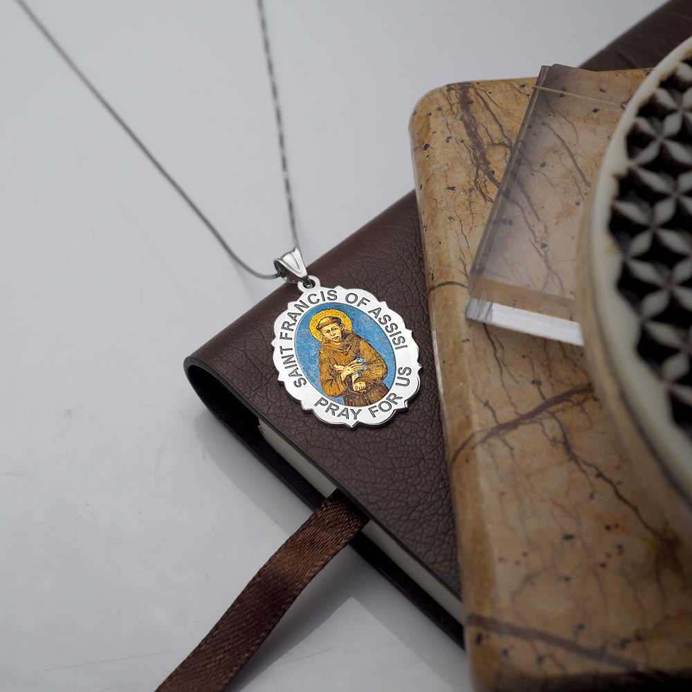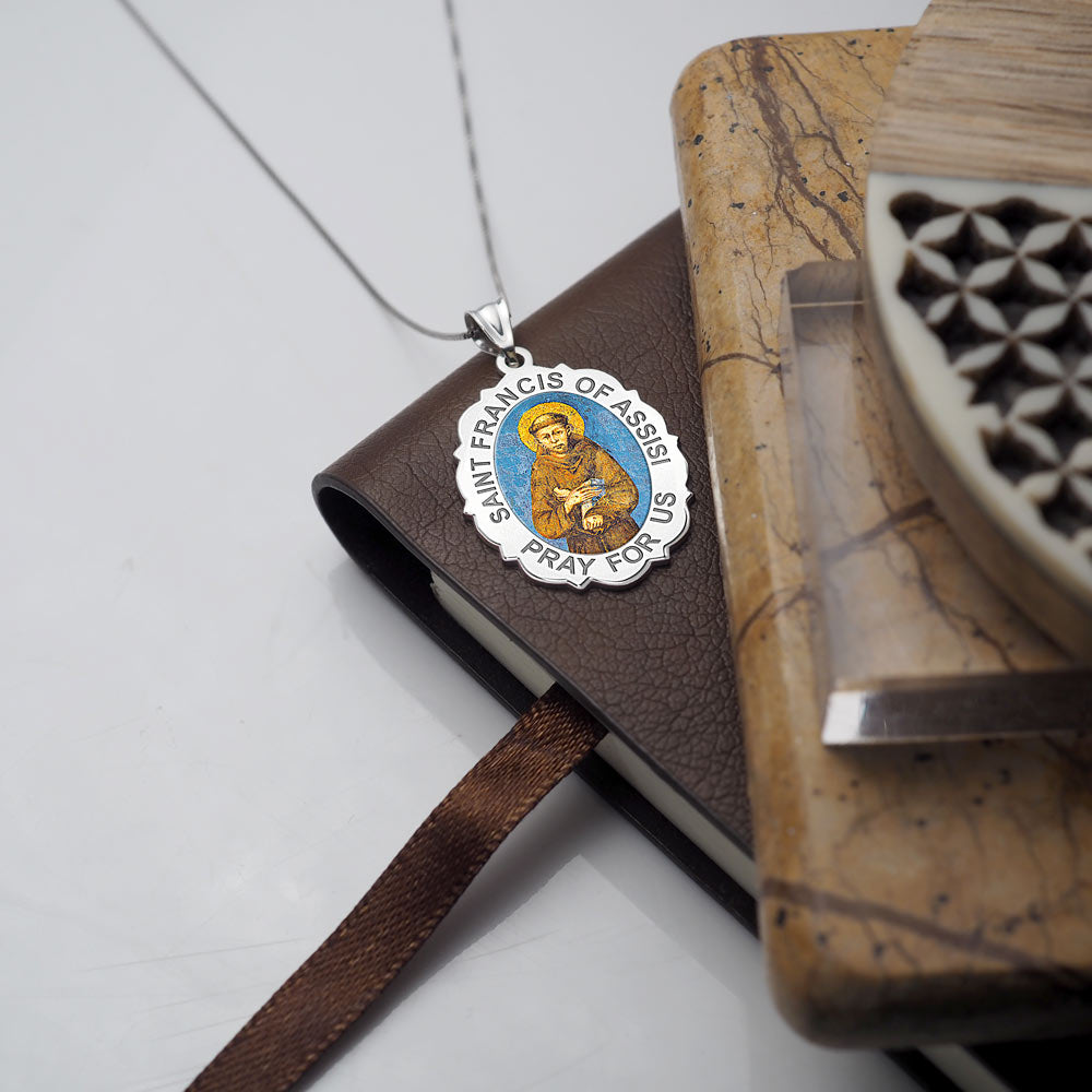 All Religious Medals are Customizable. We can change the spelling, your language, names etc, ex: change "Pray for Us" to "Pray For Me". Just let us know in "special instructions"Color Laser is a patent pending process, color is guaranteed to last foreverColor Medals can be worn in the pool, shower, etc. without affecting the image. We guarantee it.Saint Francis of Assisi (September 26, 1181 October 3, 1226) was a Roman Catholic friar and the founder of the Order of Friars Minor, more commonly known as the Franciscans. He is known as the patron saint of animals, birds, and the environment, and it is customary for Catholic churches to hold ceremonies honoring animals around his feast day of October 4.