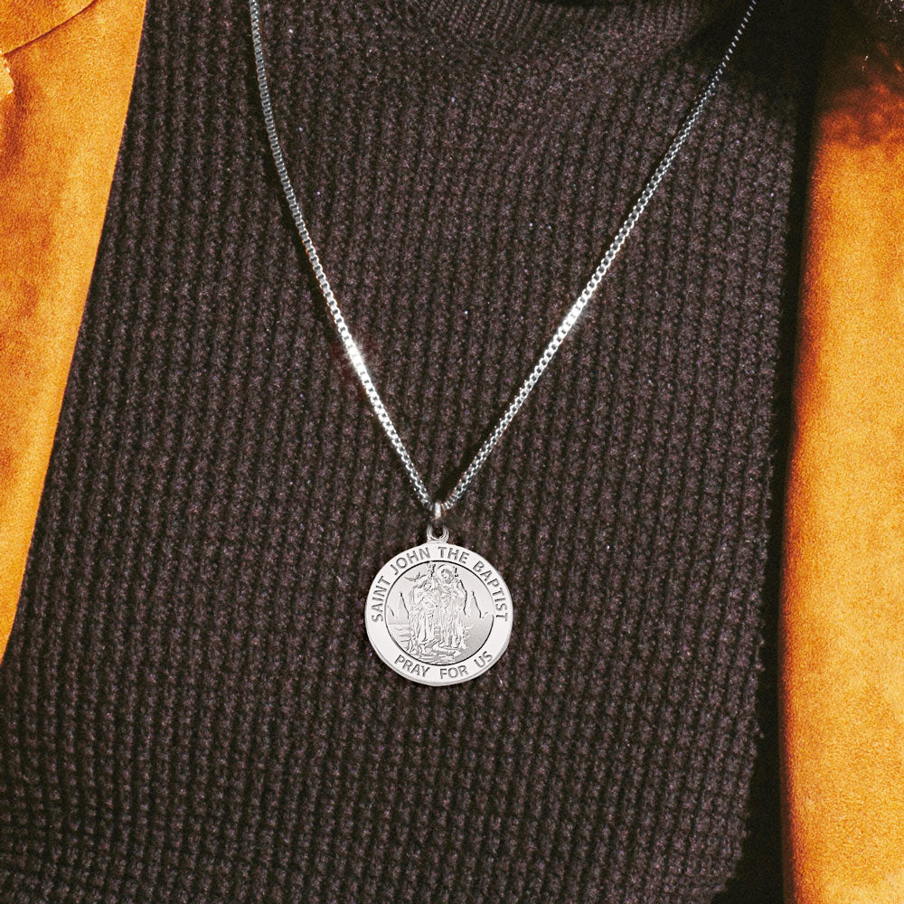 The Medal depicts St. John The Baptist baptizing Jesus, with the Holy Spirit approaching. Saint John the Baptist is the patron saint of Puerto Rico, and its capital city San Juan bears his name. In 1521, the island was given its formal name "San Juan Bautista de Puerto Rico", following the usual custom of christening the town with both its formal name and the name which Christopher Columbus had originally given the island, honoring John the Baptist. The indistinct use of "San Juan Bautista" and "Puerto Rico" for calling both the city and the island led to a reversal in practical use by most inhabitants due largely to a map-making error. Therefore by 1746 the name for the city (Puerto Rico) had become that of the entire island, while the name for the island (San Juan Bautista) had become the name for the city. The official motto for the island of Puerto Rico also references the saint, Joannes Est Nomen Eius (translated, "John is his name"). He is also a patron saint of French Canada, and Newfoundland. The Canadian cities of St. John's, Newfoundland (1497) and Saint John, New Brunswick (1604) were both named in his honor. In the UK Saint John the Baptist is the patron saint of Penzance, Cornwall. His feast day is June 24, celebrated in Quebec as the Fte nationale du Qubec (la Fte St-Jean-Baptiste).