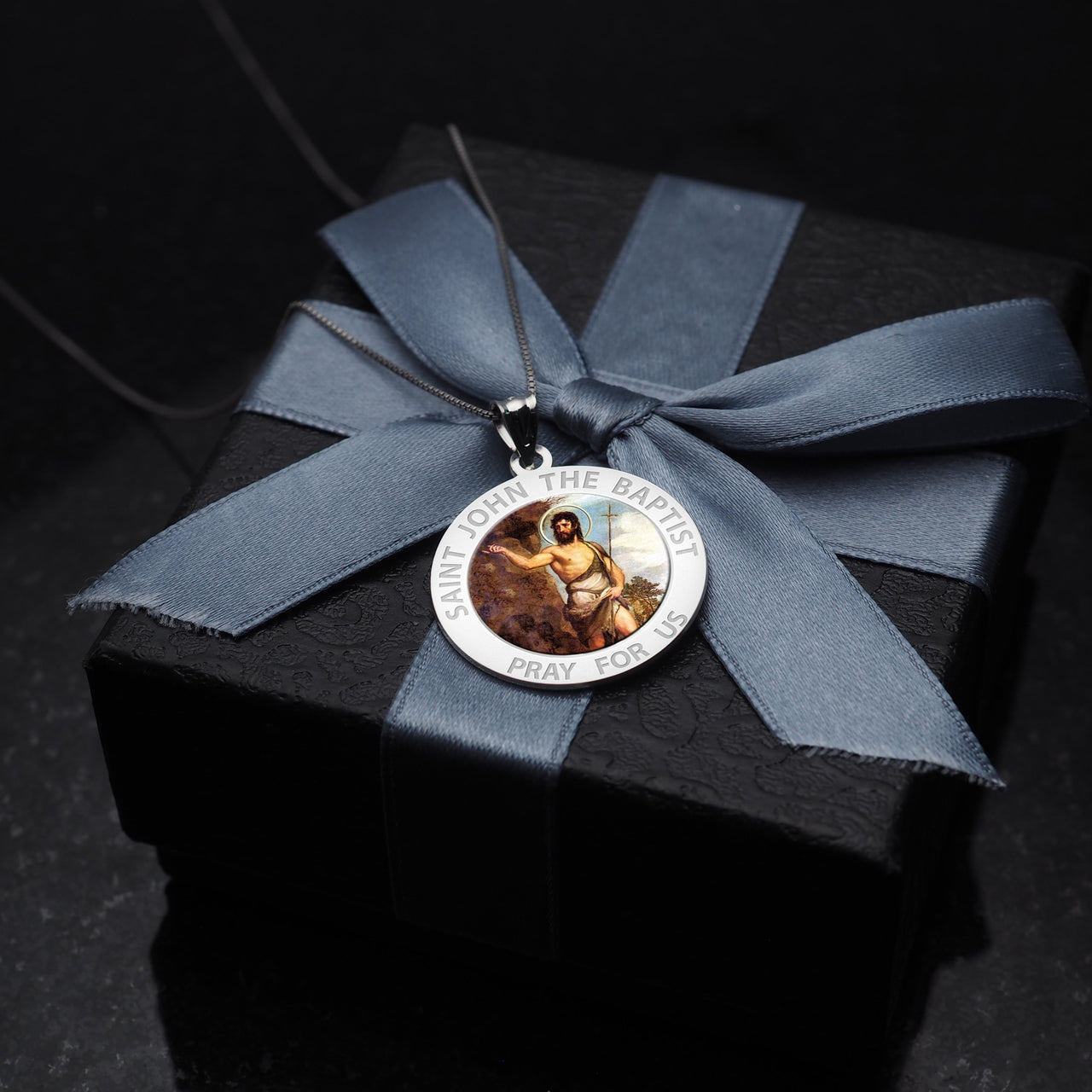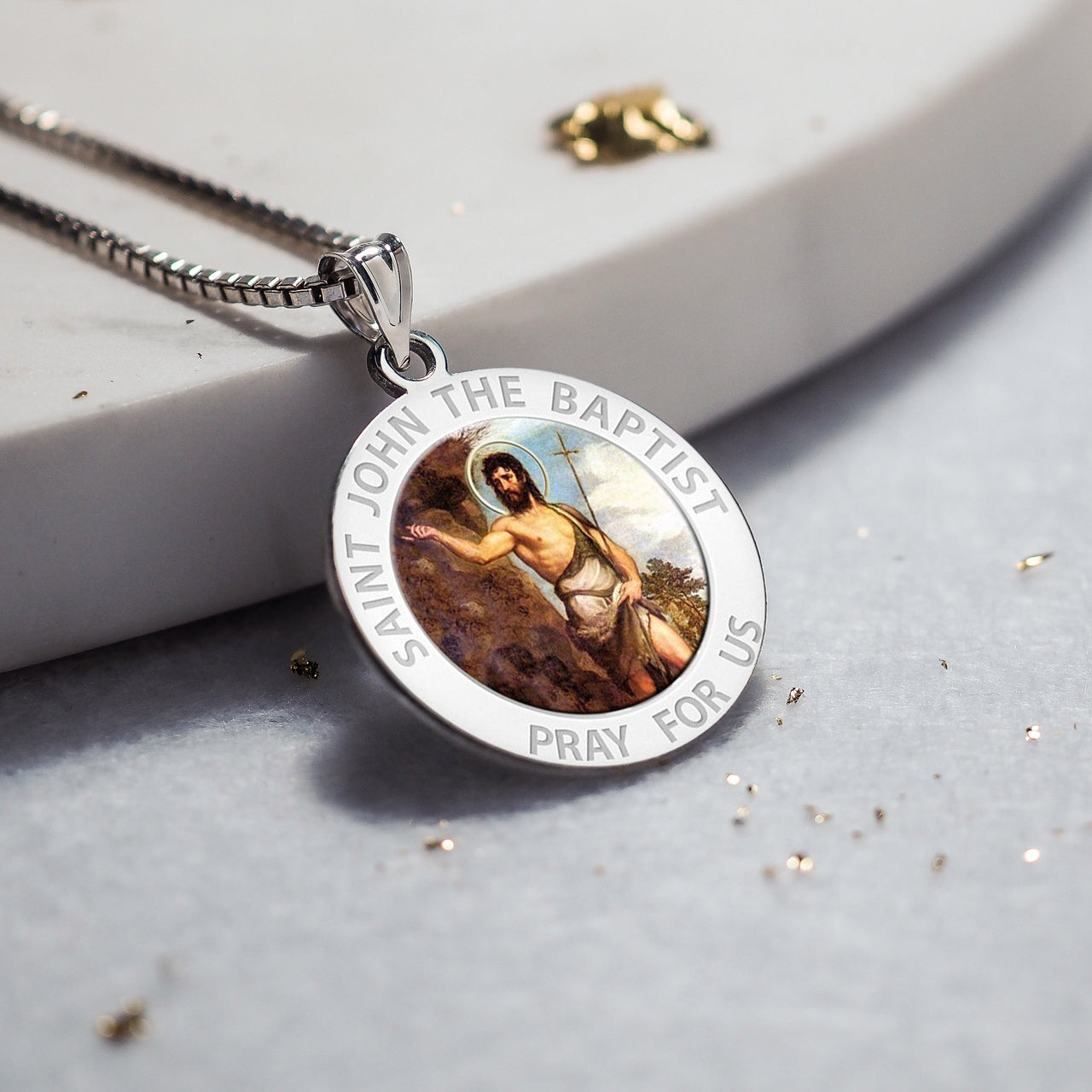 All Religious Medals are Customizable. We can change the spelling, your language, names etc, ex: change "Pray for Us" to "Pray For Me". Just let us know in "special instructions"Color Laser is a patent pending process, color is guaranteed to last foreverColor Medals can be worn in the pool, shower, etc. without affecting the image. We guarantee it.Saint John the Baptist is the patron saint of Puerto Rico, and its capital city San Juan bears his name. In 1521, the island was given its formal name "San Juan Bautista de Puerto Rico", following the usual custom of christening the town with both its formal name and the name which Christopher Columbus had originally given the island, honoring John the Baptist. The indistinct use of "San Juan Bautista" and "Puerto Rico" for calling both the city and the island led to a reversal in practical use by most inhabitants due largely to a map-making error. Therefore by 1746 the name for the city (Puerto Rico) had become that of the entire island, while the name for the island (San Juan Bautista) had become the name for the city. The official motto for the island of Puerto Rico also references the saint, Joannes Est Nomen Eius (translated, "John is his name"). He is also a patron saint of French Canada, and Newfoundland. The Canadian cities of St. John's, Newfoundland (1497) and Saint John, New Brunswick (1604) were both named in his honor. In the UK Saint John the Baptist is the patron saint of Penzance, Cornwall. His feast day is June 24, celebrated in Quebec as the Fte nationale du Qubec (la Fte St-Jean-Baptiste).