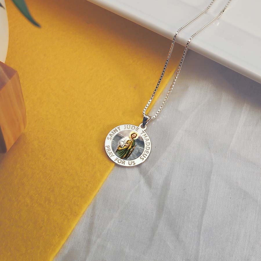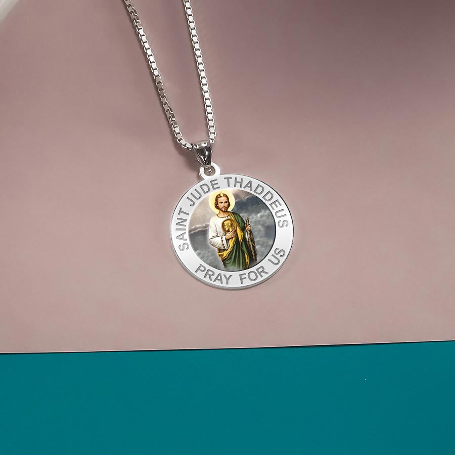 All Religious Medals are Customizable. We can change the spelling, your language, names etc, ex: change "Pray for Us" to "Pray For Me". Just let us know in "special instructions"Color Laser is a patent pending process, color is guaranteed to last foreverColor Medals can be worn in the pool, shower, etc. without affecting the image. We guarantee it.Saint Jude, one of twelve apostles, known as the Saint of impossible. People in desperate circumstances will ask St. Jude to intercede with God to obtain help with their problems.