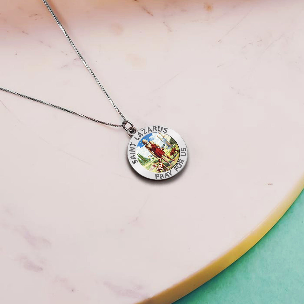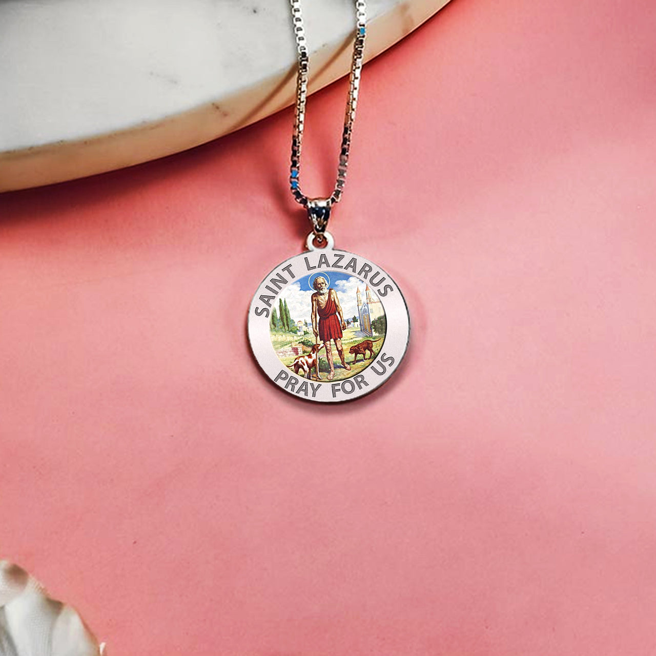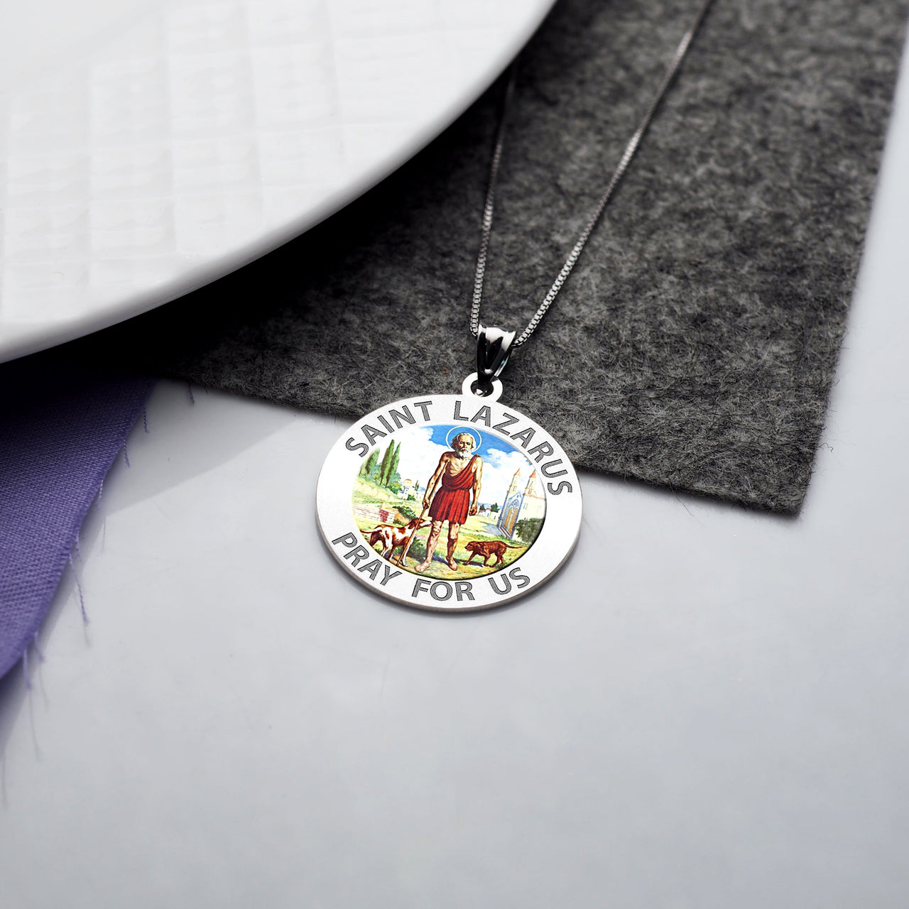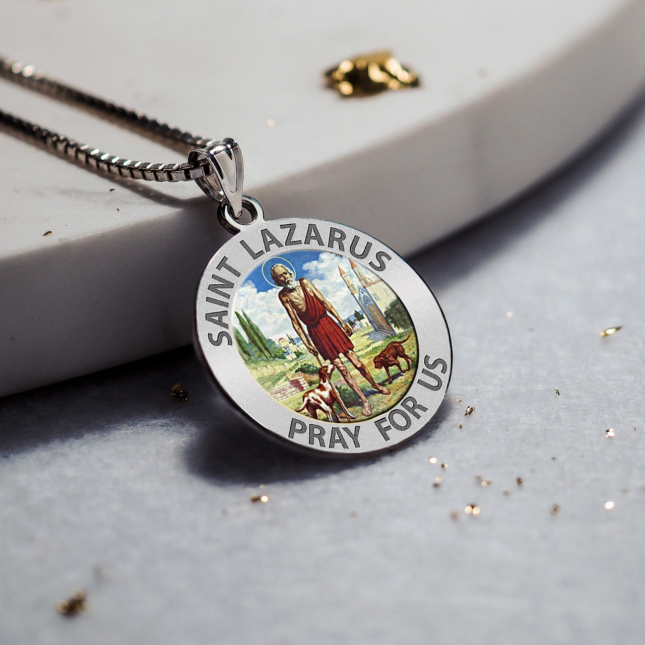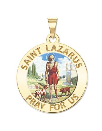All Religious Medals are Customizable. We can change the spelling, your language, names etc, ex: change "Pray for Us" to "Pray For Me". Just let us know in "special instructions"Color Laser is a patent pending process, color is guaranteed to last foreverColor Medals can be worn in the pool, shower, etc. without affecting the image. We guarantee it.Lazarus of Bethany is honored as a saint by those Christian churches which keep the commemoration of saints, although on different days, according to local traditions. In the Eastern Orthodox Church as well as the Byzantine Catholic Church, the day before Palm Sunday is celebrated as Lazarus Saturday. This day, together with Palm Sunday, hold a unique position in the church year, as days of joy and triumph between the penitence of Great Lent and the mourning of Holy Week.During the preceding week, the hymns in the Lenten Triodion track the sickness and then the death of Lazarus, and Christ's journey from beyond Jordan to Bethany. The scripture readings and hymns for Lazarus Saturday focus on the resurrection of Lazarus as a foreshadowing of the Resurrection of Christ, and a promise of the General Resurrection. The Gospel narrative is interpreted in the hymns as illustrating the two natures of Christ: his humanity in asking, "Where have ye laid him?" (John 11:34), and his divinity by commanding Lazarus to come forth from the dead (John 11:43). Many of the Resurectional hymns of the normal Sunday service, which are omitted on Palm Sunday, are chanted on Lazarus Saturday. During the Divine Liturgy, the Baptismal Hymn, "As many as have been baptized into Christ have put on Christ" (Romans 6:3), is sung in place of the Trisagion. Although the forty days of Great Lent end on the day before Lazarus Saturday, the day is still observed as a fast; however, it is s