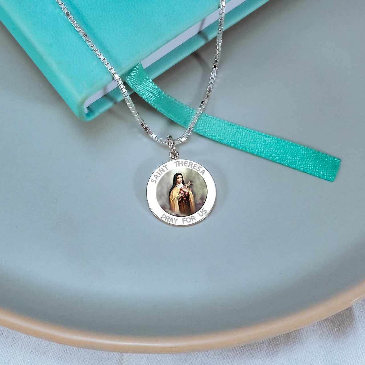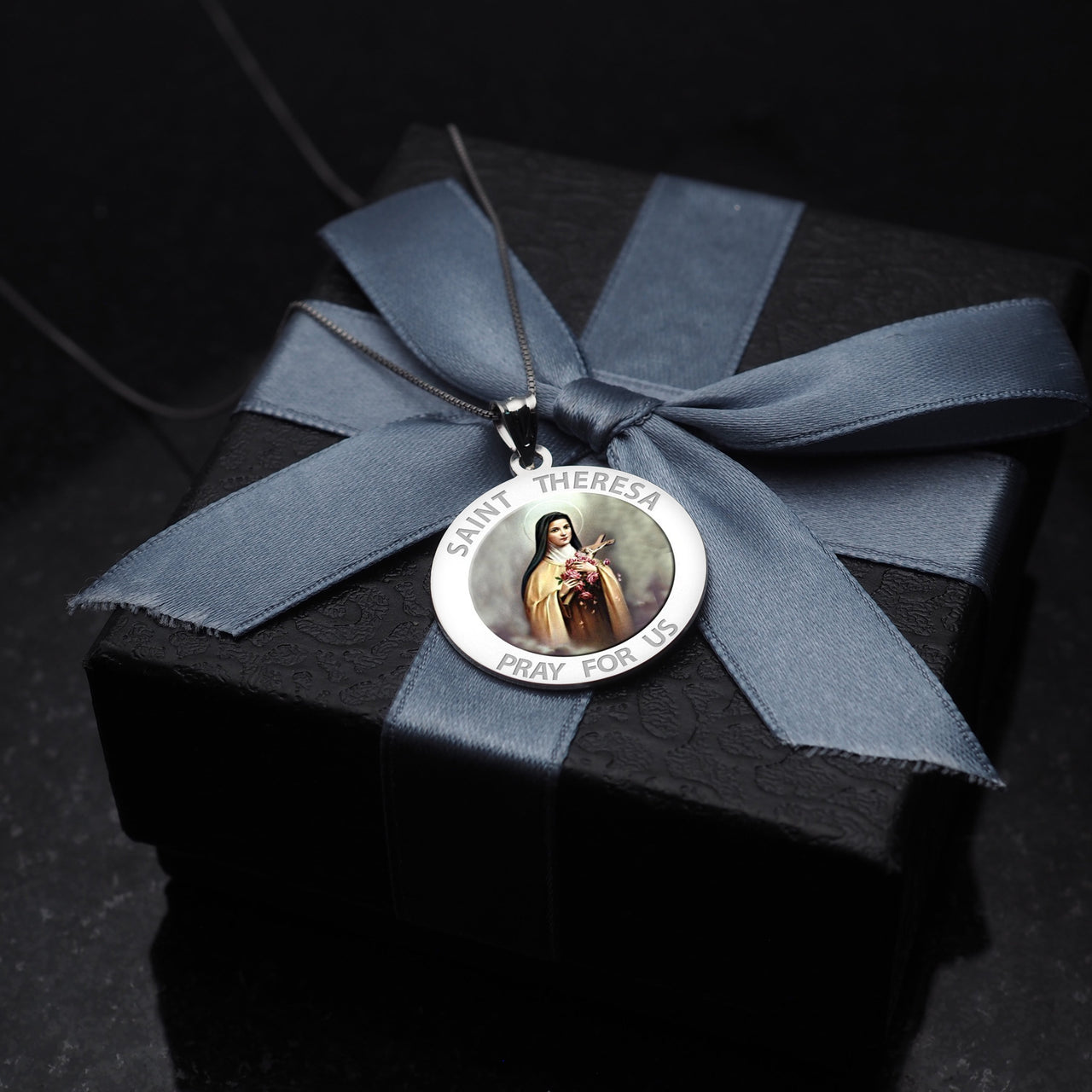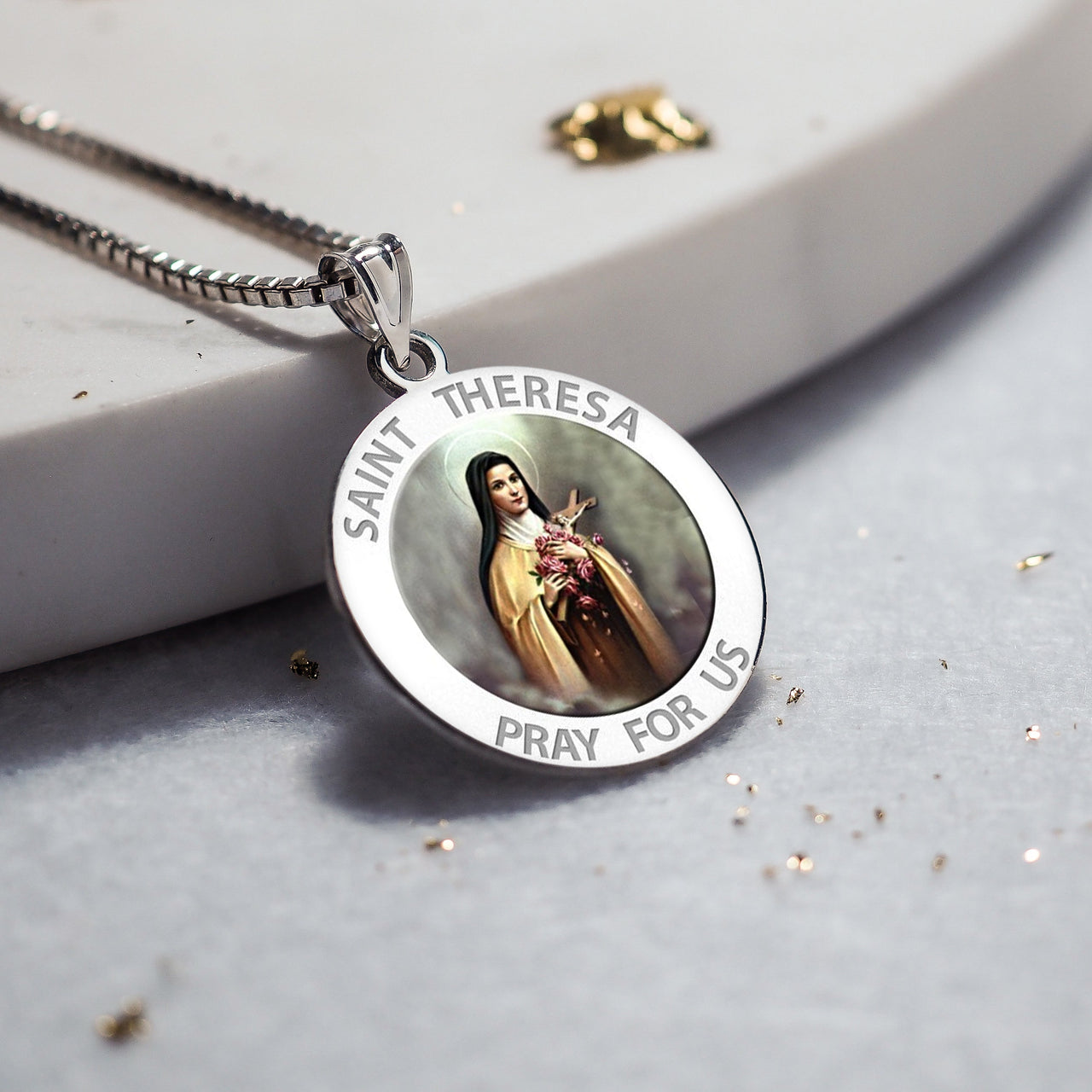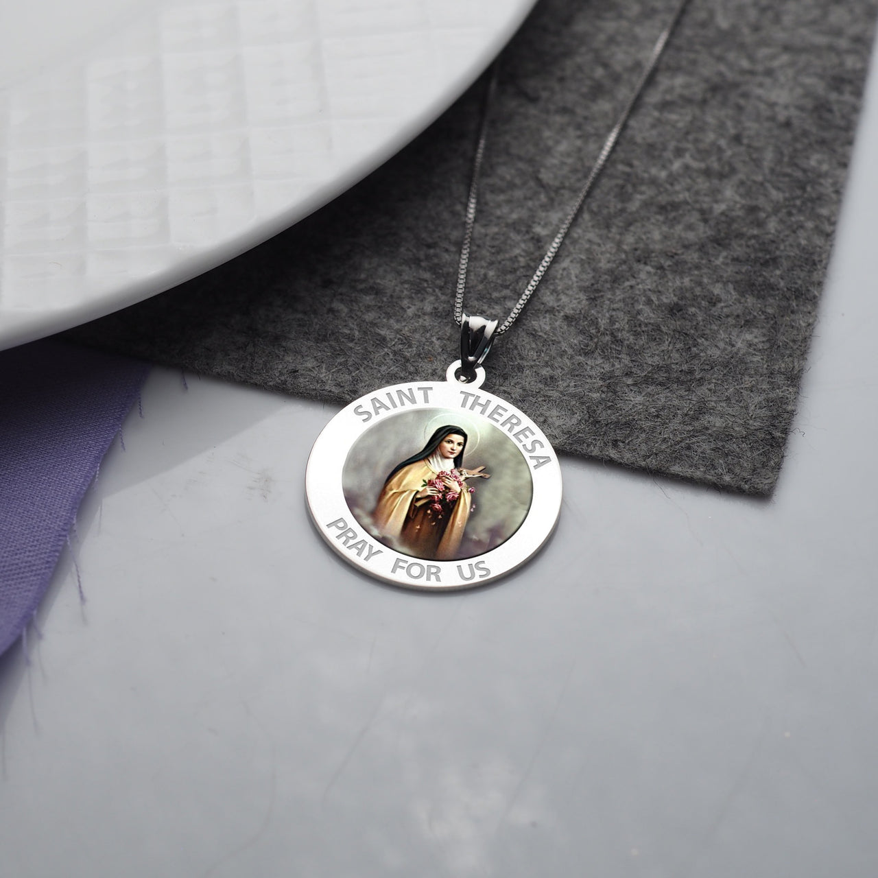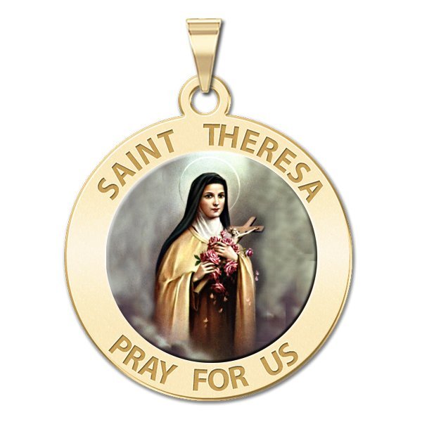 All Religious Medals are Customizable. We can change the spelling, your language, names etc, ex: change "Pray for Us" to "Pray For Me". Just let us know in "special instructions"Color Laser is a patent pending process, color is guaranteed to last foreverColor Medals can be worn in the pool, shower, etc. without affecting the image. We guarantee it.Saint Thrse de Lisieux (January 2, 1873 September 30, 1897), or more properly Sainte Thrse de l'Enfant-Jsus et de la Sainte Face ("Saint Thrse of the Child Jesus and of the Holy Face"), born Marie-Franoise-Thrse Martin, was a Roman Catholic Carmelite nun who was canonised as a saint, and is recognised as a Doctor of the Church. She is also known by many as "The Little Flower of Jesus. Her patronage consists of: AIDS sufferers; Anchorage, Alaska; Australia; aviators; bodily ills; Cheyenne, Wyoming; Fairbanks, Alaska; Fresno, California; Juneau, Alaska; Pueblo, Colorado; florists; France; illness; Kisumu, Kenya; loss of parents; missionaries; Russia; tuberculosis; Witbank, South Africa