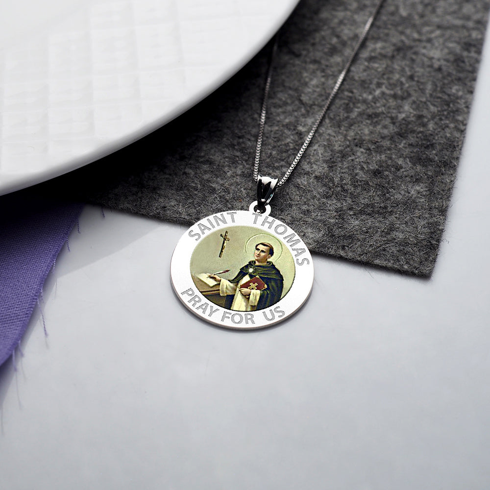 All Religious Medals are Customizable. We can change the spelling, your language, names etc, ex: change "Pray for Us" to "Pray For Me". Just let us know in "special instructions"Color Laser is a patent pending process, color is guaranteed to last foreverColor Medals can be worn in the pool, shower, etc. without affecting the image. We guarantee it.Saint Thomas Aquinas was an Italian Catholic priest in the Dominican Order, a philosopher and theologian in the scholastic tradition, known as Doctor Angelicus, Doctor Universalis and Doctor Communis. He was the foremost classical proponent of natural theology, and the father of the Thomistic school of philosophy and theology. Aquinas is held in the Catholic Church to be the model teacher for those studying for the priesthood. The works for which he is best-known are the Summa Theologica and the Summa Contra Gentiles. One of the 33 Doctors of the Church, he is considered by many Catholics to be the Catholic Church's greatest theologian and philosopher. Consequently, many institutions of learning have been named after him. He is the patron saint of Students, Architects and Builders.