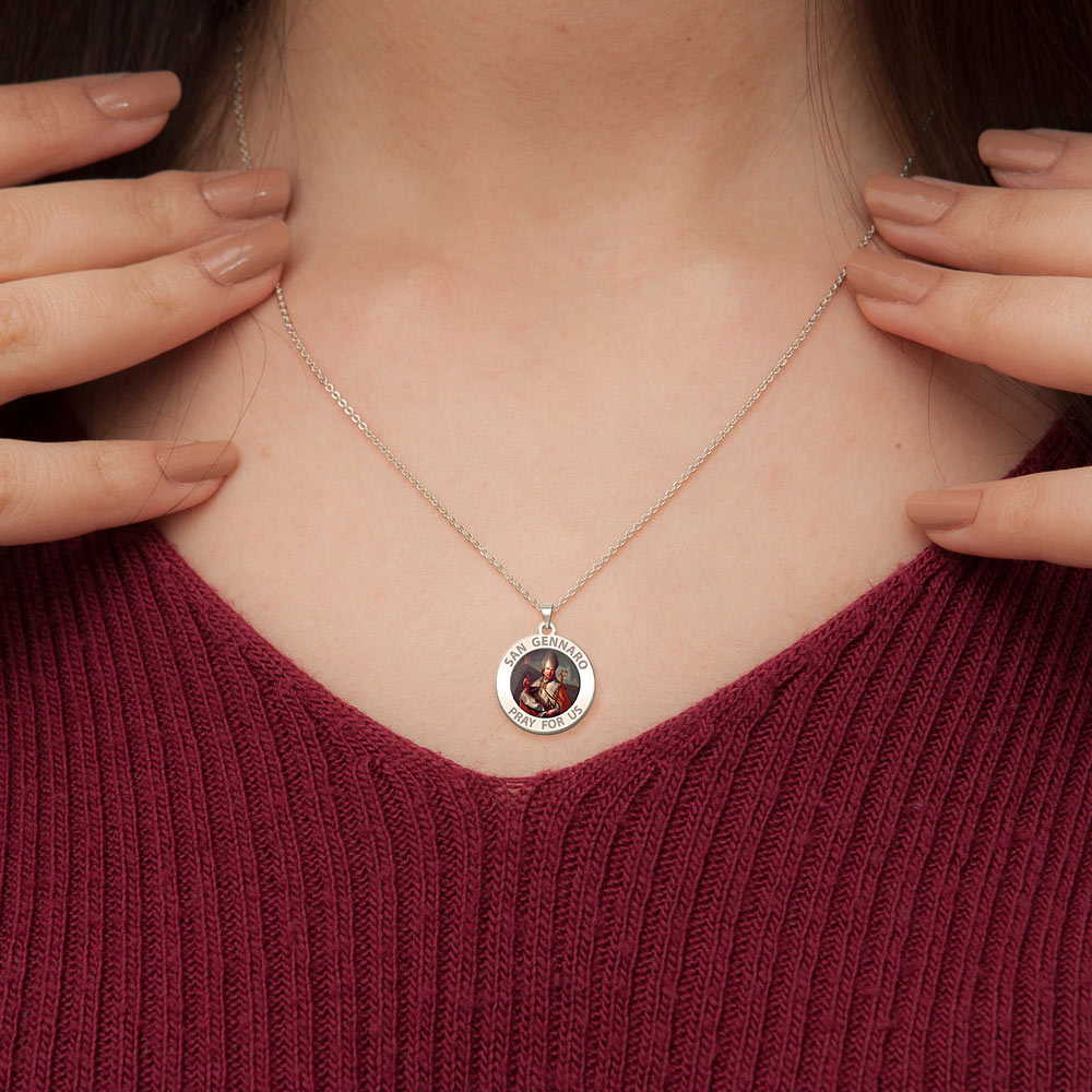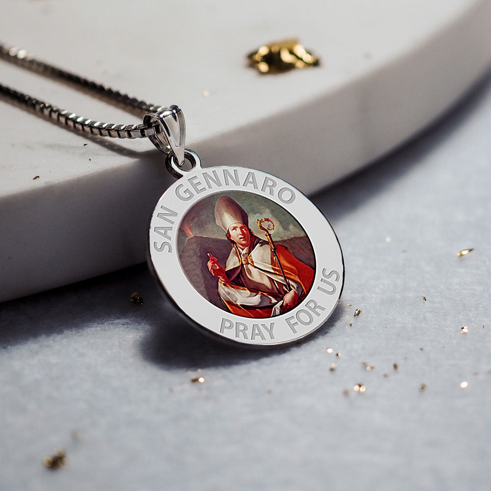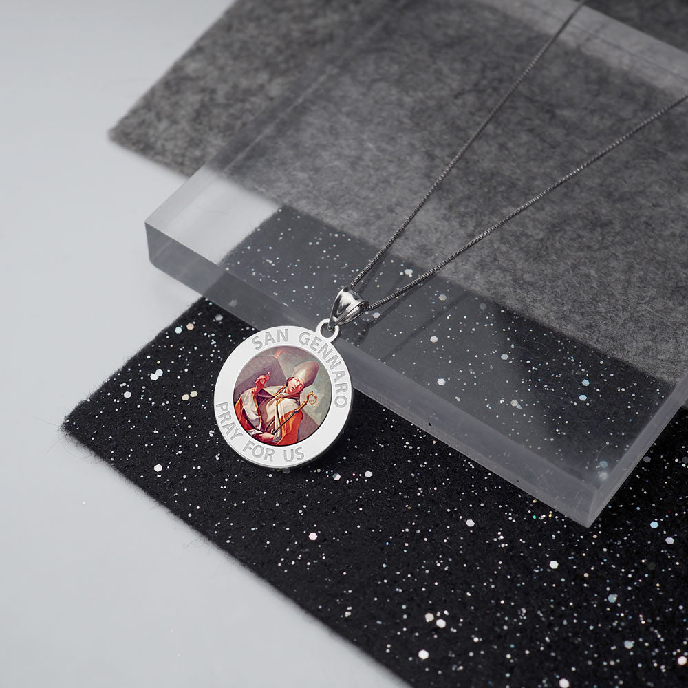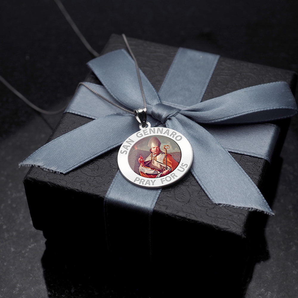 All Religious Medals are Customizable. We can change the spelling, your language, names etc, ex: change "Pray for Us" to "Pray For Me". Just let us know in "special instructions"Color Laser is a patent pending process, color is guaranteed to last foreverColor Medals can be worn in the pool, shower, etc. without affecting the image. We guarantee it.Saint Januarius, (Italian: San Gennaro), Bishop of Naples, is a martyr saint of both the Roman Catholic and the Eastern Orthodox Churches. He died around the year 305, during the Diocletianic Persecution. He was imprisoned while visiting incarcerated deacons at the sulphur mines of Puteoli, the modern Pozzuoli. After many tortures, including being thrown to lions in Pozzuoli's Flavian Amphitheater, he was beheaded at Solfatara along with his companions, who included Festus (deacon); Desiderius (lector); Sossius; Proculus of Pozzuoli; Acutius; and Euticius. The Feast of San Gennaro, originally a one-day religious commemoration, is now an 11-day street fair beginning on the second Thursday in September in the Little Italy area of Manhattan as an annual celebration of Italian culture and the Italian-American community. His feast day is September 19 in the liturgical calendar of the Roman Catholic Church. The first Feast of San Gennaro was held on September 18, 1926, by newly-arrived Neapolitan immigrants who retained the customary observance from Italy. Similar festivals have also been sponsored in other U.S. cities.
