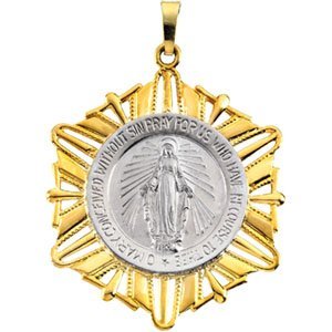 - This 14k White and Yellow Gold Miraculous Medal is the most popular selling medal. This medal represents when the Virgin Mother appeared to a nun (now Saint) and showed her this exact medal, front and back. The back Features an M surmounted by a cross with two hearts and twelve stars.