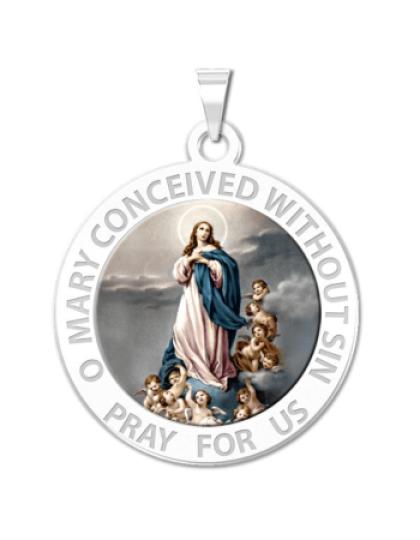 All Religious Medals are Customizable. We can change the spelling, your language, names etc, ex: change "Pray for Us" to "Pray For Me". Just let us know in "special instructions"Color Laser is a patent pending process, color is guaranteed to last foreverColor Medals can be worn in the pool, shower, etc. without affecting the image. We guarantee it.The Immaculate Conception is, according to Roman Catholic dogma, the conception of Mary, the mother of Jesus without any stain of original sin, in her mother's womb: the dogma thus says that, from the first moment of her existence, she was preserved by God from the lack of sanctifying grace that afflicts mankind, and that she was instead filled with divine grace. It is further believed that she lived a life completely free from sin. Her immaculate conception in the womb of her mother, by normal sexual intercourse (Christian tradition identifies her parents as Sts. Joachim and Anne), should not be confused with the doctrine of the virginal conception of her son Jesus. The feast of the Immaculate Conception, celebrated on December 8, was established as a universal feast in 1476 by Pope Sixtus IV. He did not define the doctrine as a dogma, thus leaving Roman Catholics freedom to believe in it or not without being accused of heresy; this freedom was reiterated by the Council of Trent. The existence of the feast was a strong indication of the Church's belief in the Immaculate Conception, even before its 19th century definition as a dogma. In the Roman Catholic Church, the Solemnity of the Immaculate Conception is a Holy Day of Obligation, except where conferences of bishops have decided, with the approval of the Holy See, not to maintain it as such. It is a public holiday in some countries where Roman Catholicism is predominant e.g. Italy. In the Philippines, alt
