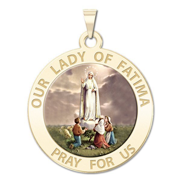 All Religious Medals are Customizable. We can change the spelling, your language, names etc, ex: change "Pray for Us" to "Pray For Me". Just let us know in "special instructions"Color Laser is a patent pending process, color is guaranteed to last foreverColor Medals can be worn in the pool, shower, etc. without affecting the image. We guarantee it.Our Lady of Ftima (pronounced [fatim]) is the title given to the Blessed Virgin Mary by those who believe that she appeared to three shepherd children at Ftima, Portugal on the 13th day of six consecutive months in 1917, starting on 13 May, the Ftima holiday. The three children were Lcia dos Santos and siblings Francisco and Jacinta Marto. The title of Our Lady of the Rosary is also sometimes used in reference to the same apparition (although it was first used in 1208 for the reported apparition in the church of Prouille); because the children related that the Lady in the apparition specifically identified Herself as "the Lady of the Rosary." It is also common to see a combination of these titles, i.e., Our Lady of the Rosary of Ftima
