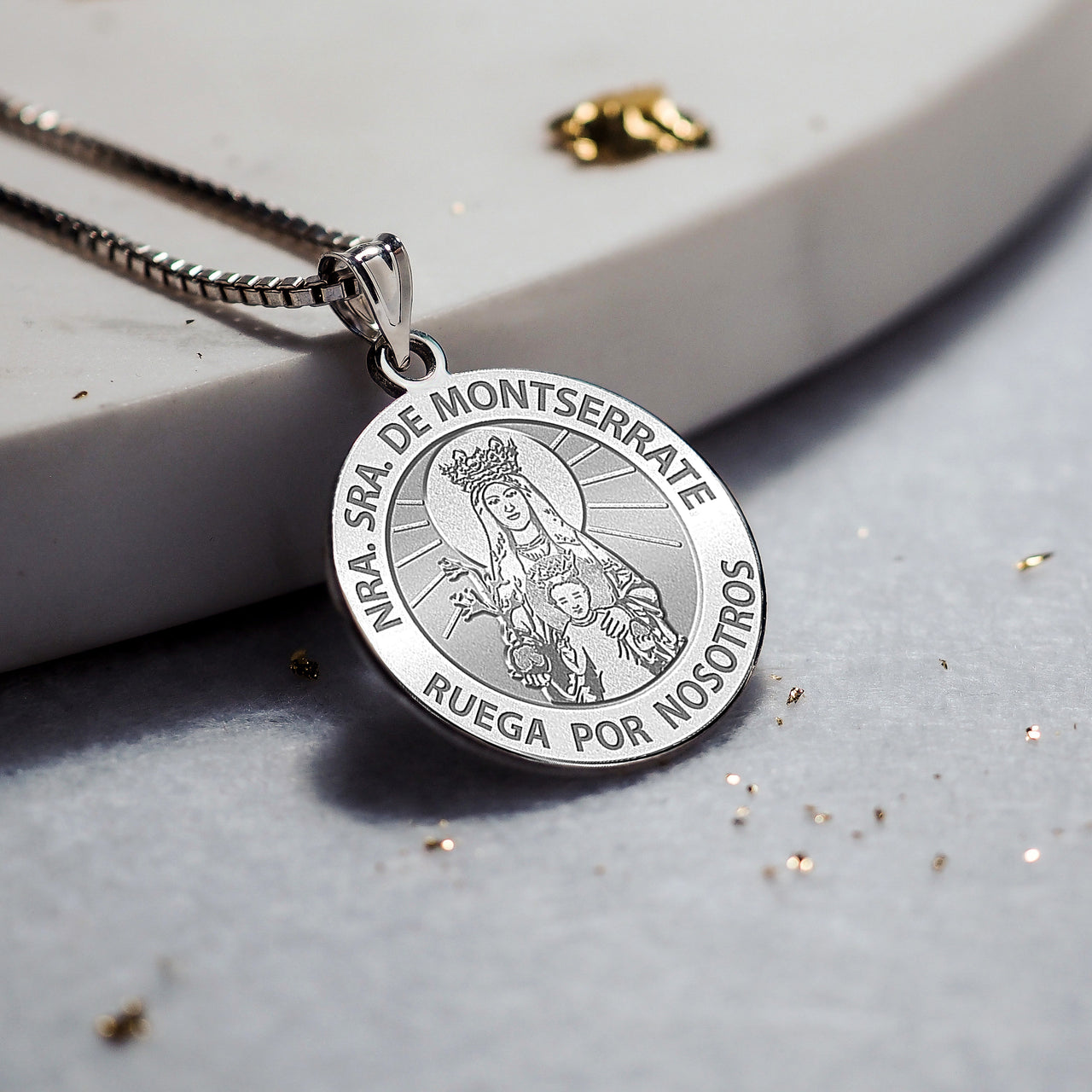 All Religious Medals are Customizable. We can change the spelling, your language, names etc, ex: change "Pray for Us" to "Pray For Me". Just let us know in "special instructions"The Virgin of Montserrat is a statue of the Virgin Mary and infant Christ venerated at the Santa Maria de Montserrat monastery in the Montserrat mountain in Catalonia. It is one of the black Madonnas of Europe, hence its familiar Catalan name, la Moreneta ("The little dark-skinned one"). Believed by some to have been carved in Jerusalem in the early days of the Church, it is more possibly a Romanesque sculpture in wood from the late 12th century. Legend has it that the Benedictine monks could not move the statue to construct their monastery, choosing to instead build around it. The statue's sanctuary is located at the rear of the chapel, where an altar of gold surrounds the icon, and is now a site of pilgrimage. Upon his recovery from battle wounds, Ignatius of Loyola visited the Benedictine monastery of Montserrat (March 25, 1522), where he laid down his military accoutrements before the image. Then he led a period of asceticism before later founding the Society of Jesus. On September 11, 1844, Pope Leo XIII declared the virgin of Montserrat patroness of Catalonia (Saint George is another patron saint.) The hymn to the Virgin of Montserrat, known as Virolai and sung every day by the Escolania de Montserrat, begins with the words: "Rosa dabril, Morena de la serra..." (April rose, dusky lady of the mountain chain...). Therefore this virgin is sometimes also known as Rosa dabril.