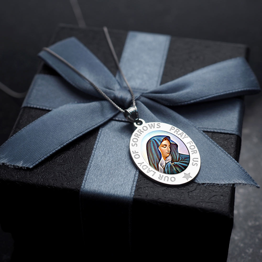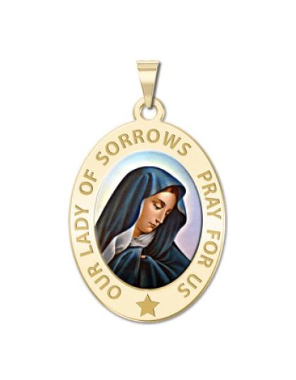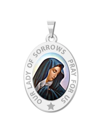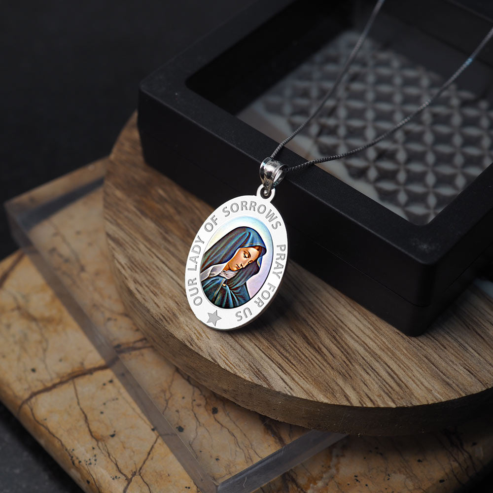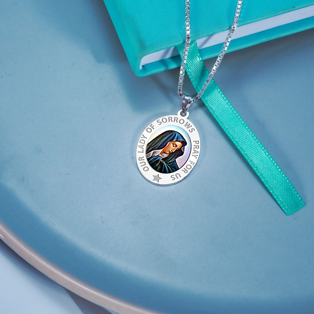 All Religious Medals are Customizable. We can change the spelling, your language, names etc, ex: change "Pray for Us" to "Pray For Me". Just let us know in "special instructions"Color Laser is a patent pending process, color is guaranteed to last foreverColor Medals can be worn in the pool, shower, etc. without affecting the image. We guarantee it.Our Lady of Sorrows s a title of the Blessed Virgin Mary and the name of a feast celebrated on September 15. The Seven Dolours of the Virgin (or Seven Sorrows of the Virgin) is a related devotion in the Catholic Church which has its origins in the New Testament prophecy of Simeon (Luke 2:35). She is the patron saint of Slovakia, the state of Mississippi, the Congregation of Holy Cross, and Mola di Bari, Italy.