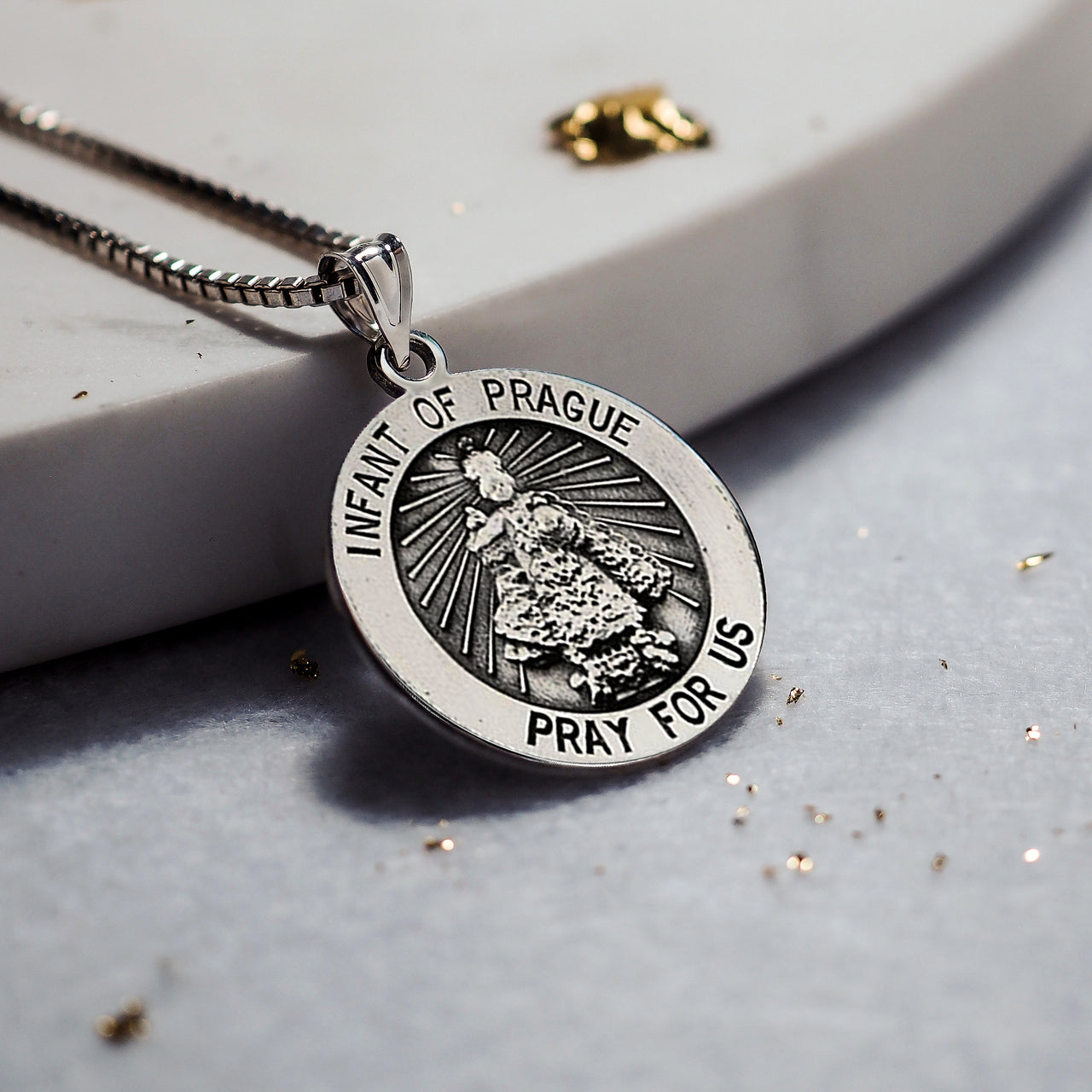 - This 14K Solid Gold Infant of Prague Medal Depicts the statue of the Christ Child King. The Infant Jesus told one of his subjects "occupy yourself with my interests, and I will occupy myself with yours"