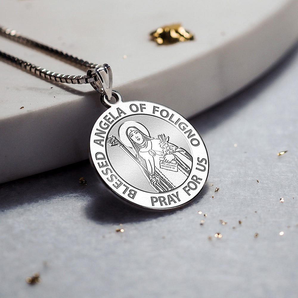 All Religious Medals are Customizable. We can change the spelling, your language, names etc, ex: change "Pray for Us" to "Pray For Me". Just let us know in "special instructions"Angela of Foligno (c. 1248 4 January 1309) was a Christian author, nun, and mystic. She was noted not only for her spiritual writings, but also for founding a religious order. Angela was born into a wealthy family in the city of Foligno, Italy (near Assisi). She married at an early age, and traditional accounts state that she lived "wildly, adulterously, and sacrilegiously" in her early years. However, Angela's lifestyle abruptly changed following the deaths of her family and an unknown shameful sin. In 1285, she prayed to the late Francis of Assisi, who then appeared to her in a dream and offered to help. Some time after her conversion Angela had placed herself under the direction of a Franciscan friar named Arnoldo, who would serve as her confessor. It was to Arnoldo that Angela dictated the account of her conversion, a work that has come to us as the Book of Visions and Instructions. Further, it was under Arnoldo's instruction that Angela joined the Third Order of Saint Francis. In the course of time the fame of her sanctity gathered around her a number of Tertiaries, men and women, who strove under her direction to advance in holiness. Later she established at Foligno a community of sisters, who to the Rule of the Third Order added the three vows of poverty, chastity, and obedience, without, however, binding themselves to enclosure, so that they might devote their time to works of charity. Angela died, surrounded by her community. Her remains repose uncorrupted (her corpse has never deteriorated) in the church of St. Francis at Foligno. Many people attributed miracles to her, which were accomplished at her tomb. Pope Innocent XII approved the ve