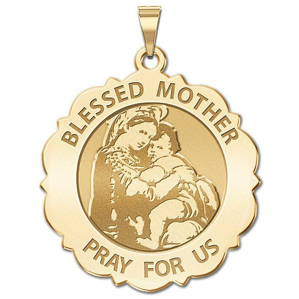 All Religious Medals are Customizable. We can change the spelling, your language, names etc, ex: change "Pray for Us" to "Pray For Me". Just let us know in "special instructions"This Medal represents the Virgin Mary holding the baby Jesus. The engraved image is based on the Raphael Sanzio painting "Madonna of the Chair."