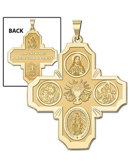 - The Four Way Medal is also known as a Cruciform, and also a Scapular Medal (It takes the latter name from the medal at the top. Traditionally, the Scapular Medal features the Sacred Heart of Jesus on one side and Our Lady of Mt. Carmel on the other side, which, on this medal, is on the reverse). To the right of the Four Way Medal is the ever-popular St. Christopher medal; at the bottom is the equally popular Miraculous Medal; and to the left is the husband of Mary, St. Joseph. The words I am a Catholic; please call a priest are inscribed on the back, to indicate to an emergency worker the wearers desire for the last sacraments.