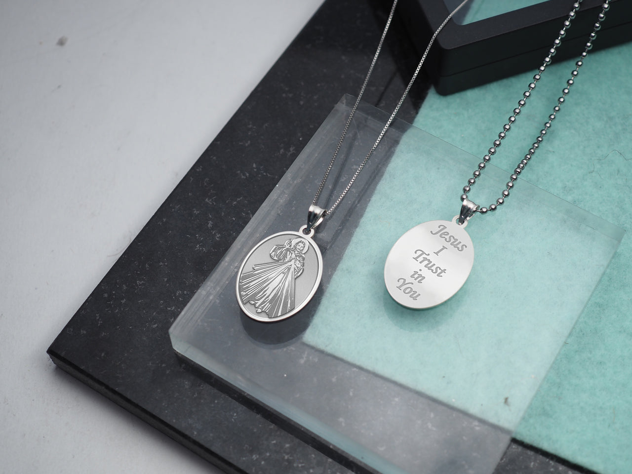 All Religious Medals are Customizable. We can change the spelling, your language, names etc, ex: change "Pray for Us" to "Pray For Me". Just let us know in "special instructions"The front of the medal features the lord Jesus Christ and the back inscribes the words "Jesus I Trust In You." The Divine Mercy is a Christian devotion focused on the mercy of God and its power, particularly as a form of thanksgiving and entrusting of oneself to God's mercy. The devotion as known today can be traced to Polish nun and canonized saint, Sister Faustyna Kowalska, known as the "Apostle of Mercy", who lived from 1905-1938. It is known that anyone who seeks God's mercy will not be turned away (Matthew 7:7). "Jesus I Trust In You" are the words inscribed on a picture that Faustina had said was to be made at the request of Jesus himself through the inner speakings of the Lord to Faustina. In 2000, Pope John Paul II officially instituted the Feast of the Divine Mercy universally for the Catholic Church on the same day that he also canonized St. Faustina.