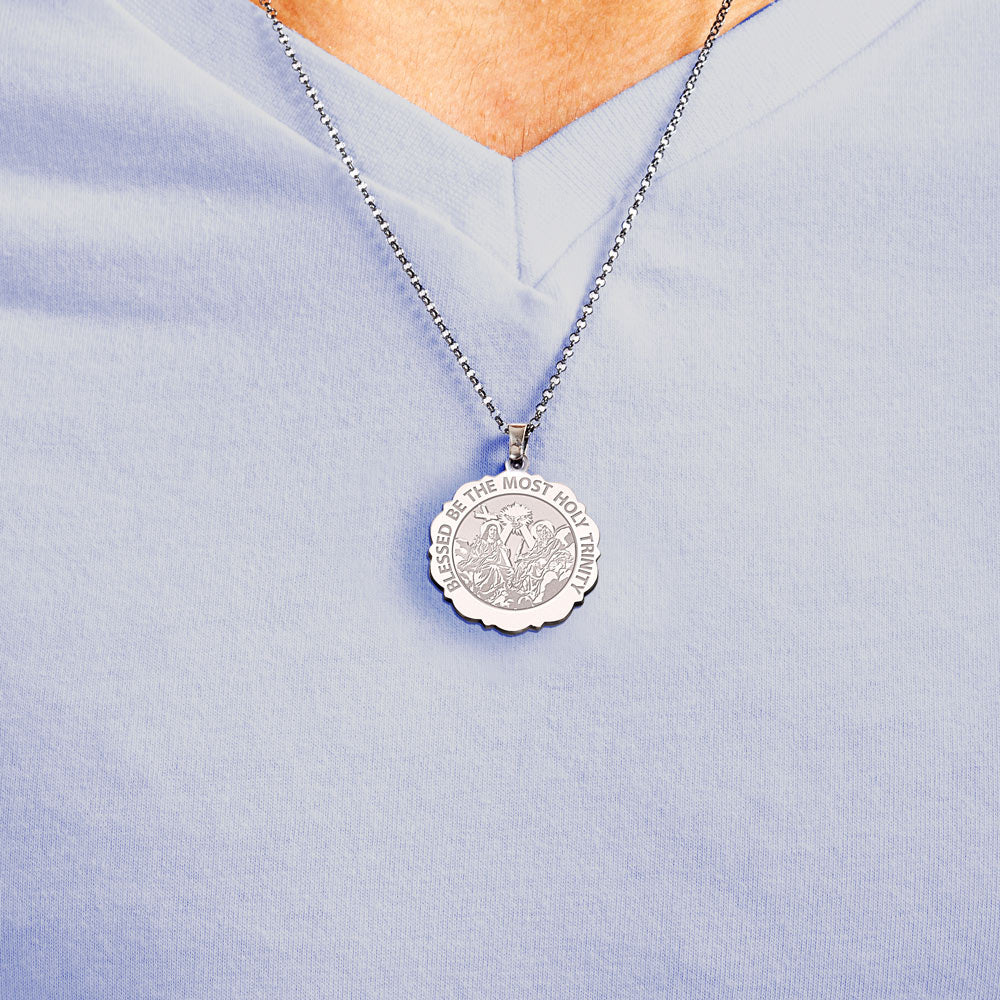 All Religious Medals are Customizable. We can change the spelling, your language, names etc, ex: change "Pray for Us" to "Pray For Me". Just let us know in "special instructions"The Trinity is a Christian doctrine, stating that God is one Being Who exists, simultaneously and eternally, as a mutual indwelling of three persons (not to be confused by "person"): the Father, the Son (incarnate as Jesus of Nazareth), and the Holy Spirit. Since the 4th century, in both Eastern Christianity and Western Christianity, this doctrine has been stated as " three persons in one God," all three of whom, as distinct and co-eternal persons, are of one indivisible Divine essence, a simple being. The doctrine also teaches that the Son Himself has two distinct natures, one fully divine and the other fully human, united in a hypostatic union. Support of the doctrine of the Trinity is known as Trinitarianism. Most denominations within Christianity are Trinitarian, and regard belief in the Trinity as a mark of Christian orthodoxy.