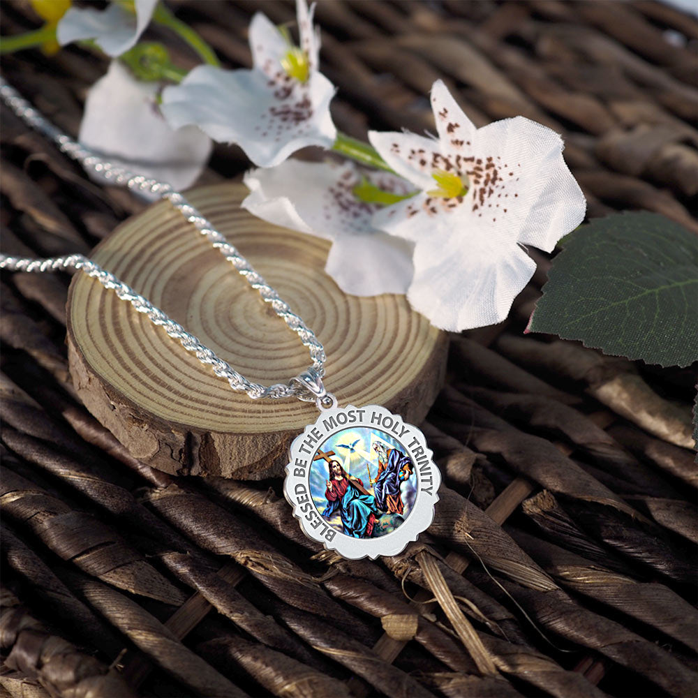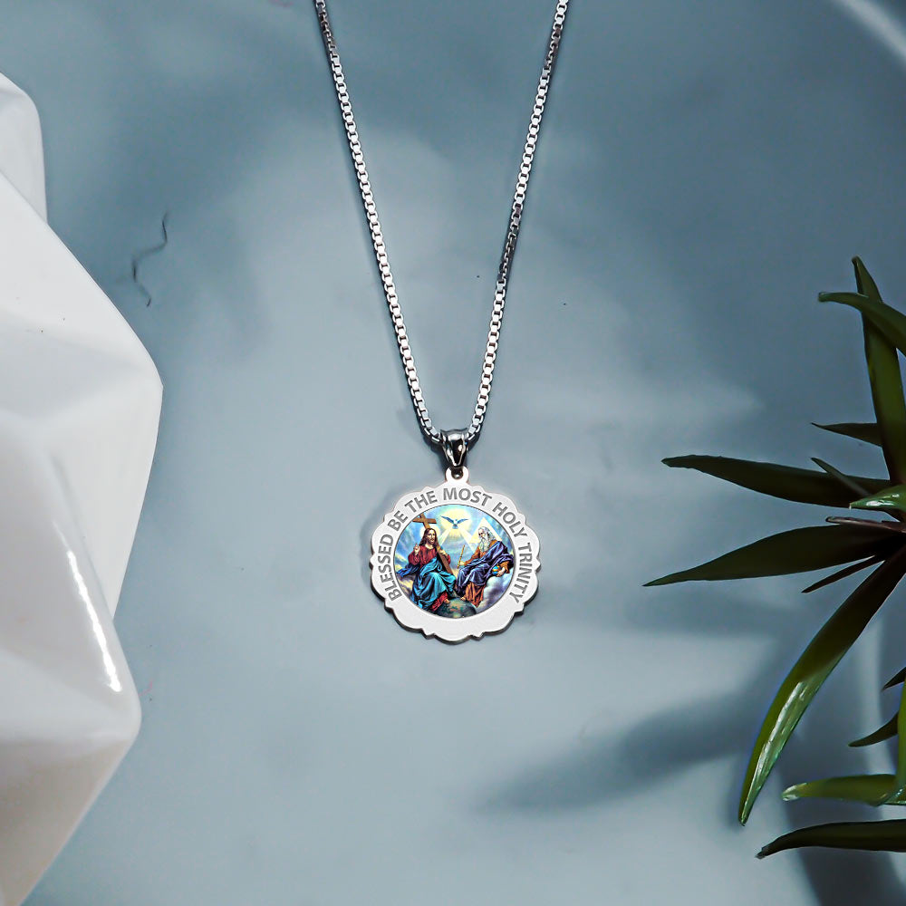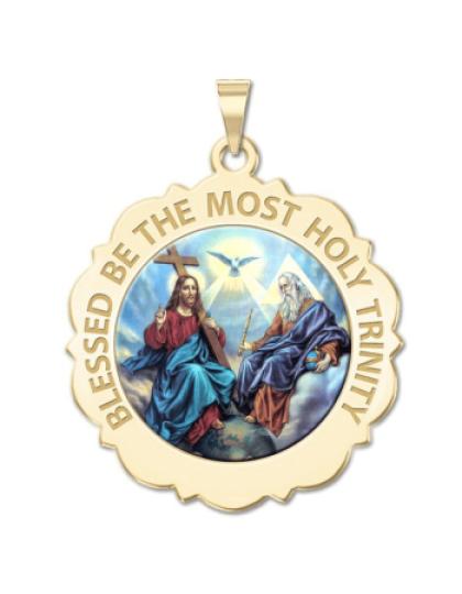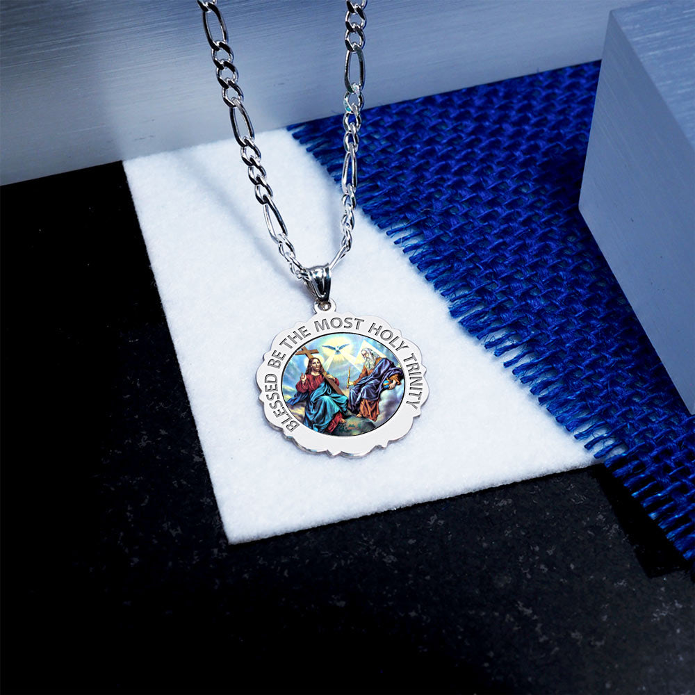 All Religious Medals are Customizable. We can change the spelling, your language, names etc, ex: change "Pray for Us" to "Pray For Me". Just let us know in "special instructions"Color Laser is a patent pending process, color is guaranteed to last foreverColor Medals can be worn in the pool, shower, etc. without affecting the image. We guarantee it.The Trinity is a Christian doctrine, stating that God is one Being Who exists, simultaneously and eternally, as a mutual indwelling of three persons (not to be confused by "person"): the Father, the Son (incarnate as Jesus of Nazareth), and the Holy Spirit. Since the 4th century, in both Eastern Christianity and Western Christianity, this doctrine has been stated as " three persons in one God," all three of whom, as distinct and co-eternal persons, are of one indivisible Divine essence, a simple being. The doctrine also teaches that the Son Himself has two distinct natures, one fully divine and the other fully human, united in a hypostatic union. Support of the doctrine of the Trinity is known as Trinitarianism. Most denominations within Christianity are Trinitarian, and regard belief in the Trinity as a mark of Christian orthodoxy.