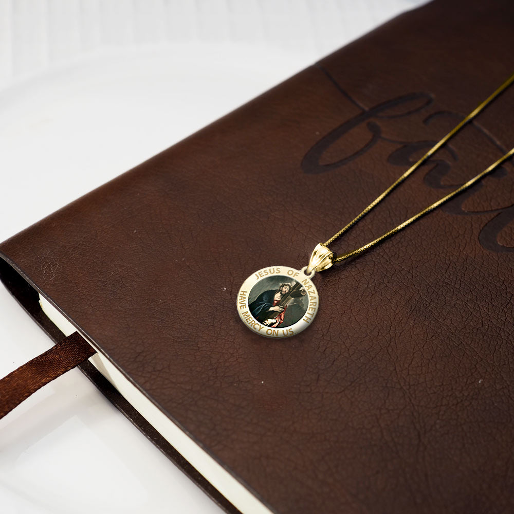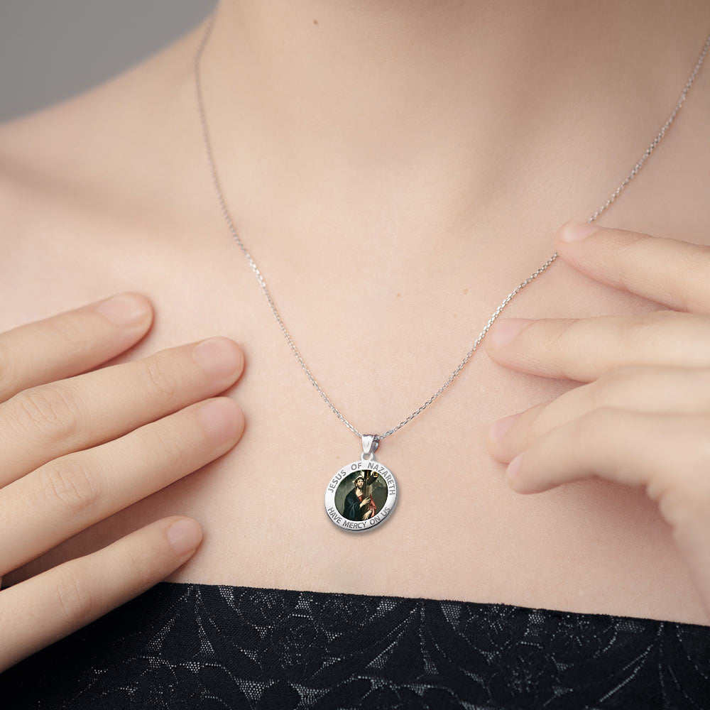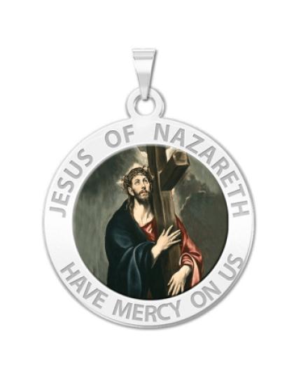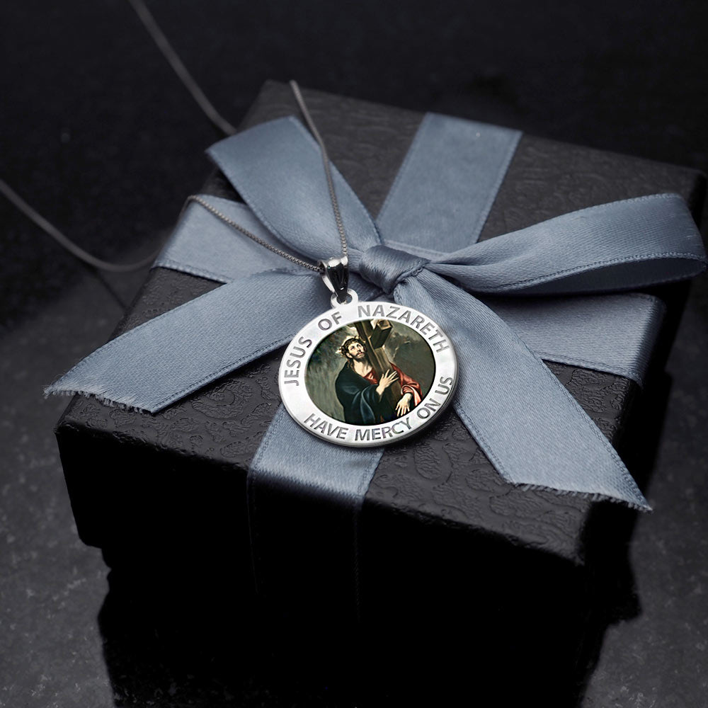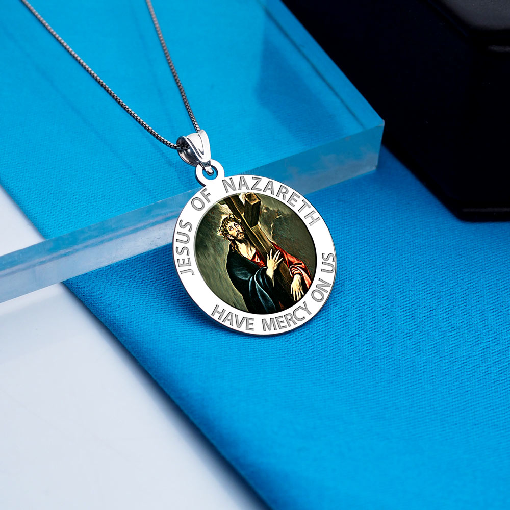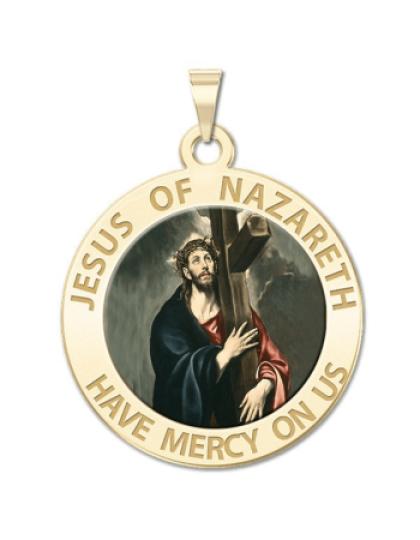 All Religious Medals are Customizable. We can change the spelling, your language, names etc, ex: change "Pray for Us" to "Pray For Me". Just let us know in "special instructions"Color Laser is a patent pending process, color is guaranteed to last foreverColor Medals can be worn in the pool, shower, etc. without affecting the image. We guarantee it.The Image depicts the Lord Jesus Christ carrying the cross, while wearing the crown of thorns. The image was inspired by a El Greco painting.