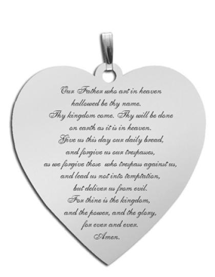 All Religious Medals are Customizable. We can change the spelling, your language, names etc, ex: change "Pray for Us" to "Pray For Me". Just let us know in "special instructions"Item is available in Solid Sterling Silver, Solid 14k Yellow Gold or Solid 14k White Gold. 3/4 inch x 3/4 inch Heart Pendant is about the same size as a Nickel. 1 inch x 1 inch Heart Pendant is about the same size as a Quarter. The Lord's Prayer, also known as the Our Father or Pater noster, is perhaps the best-known prayer in Christianity. Two versions of it occur in the New Testament, one in the Gospel of Matthew 6:913 as part of the discourse on ostentation, a section of the Sermon on the Mount; and the other in the Gospel of Luke 11:24. The context of the prayer in Matthew is as part of a discourse deploring people who pray simply for the purpose of being seen to pray; Matthew describes Jesus as instructing people to pray "after the manner" of this prayer. Taking into account the prayer's structure, flow of subject matter and emphases, one interpretation of the Lord's Prayer is as a guideline on how to pray rather than something to be learned and repeated by rote.