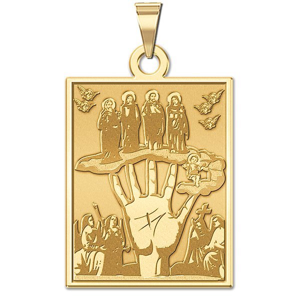 All Religious Medals are Customizable. We can change the spelling, your language, names etc, ex: change "Pray for Us" to "Pray For Me". Just let us know in "special instructions"The upward-pointing late Roman Hand of Power talisman continues in popularity today in the form of the Roman Catholic Powerful Hand (Mano Poderosa in Spanish) which is sold on holy cards and applied to votive candles. The meaning of the hand is the same as in ancient times -- magical protection and benediction -- but in the modern Catholic version, the fingers are all stretched upright, as is the thumb, and various saints and angels are standing on and around the digits. The palm, with its stigmata, faces toward the viewer. The figures that stand at the top of the four fingers represent St. Joseph, the Virgin Mary, and her parents, St. Joachim and St. Anne. The Christ Child is depicted on the thumb.