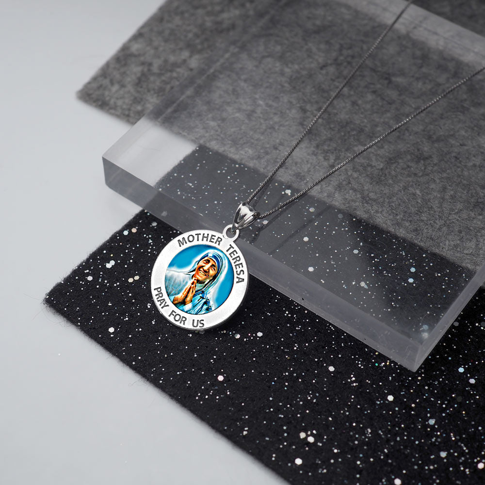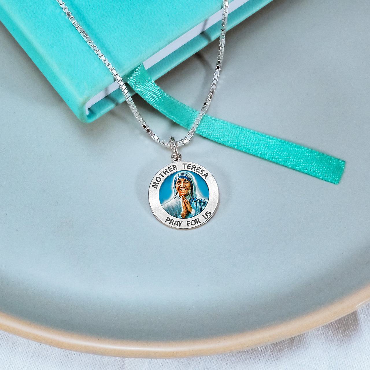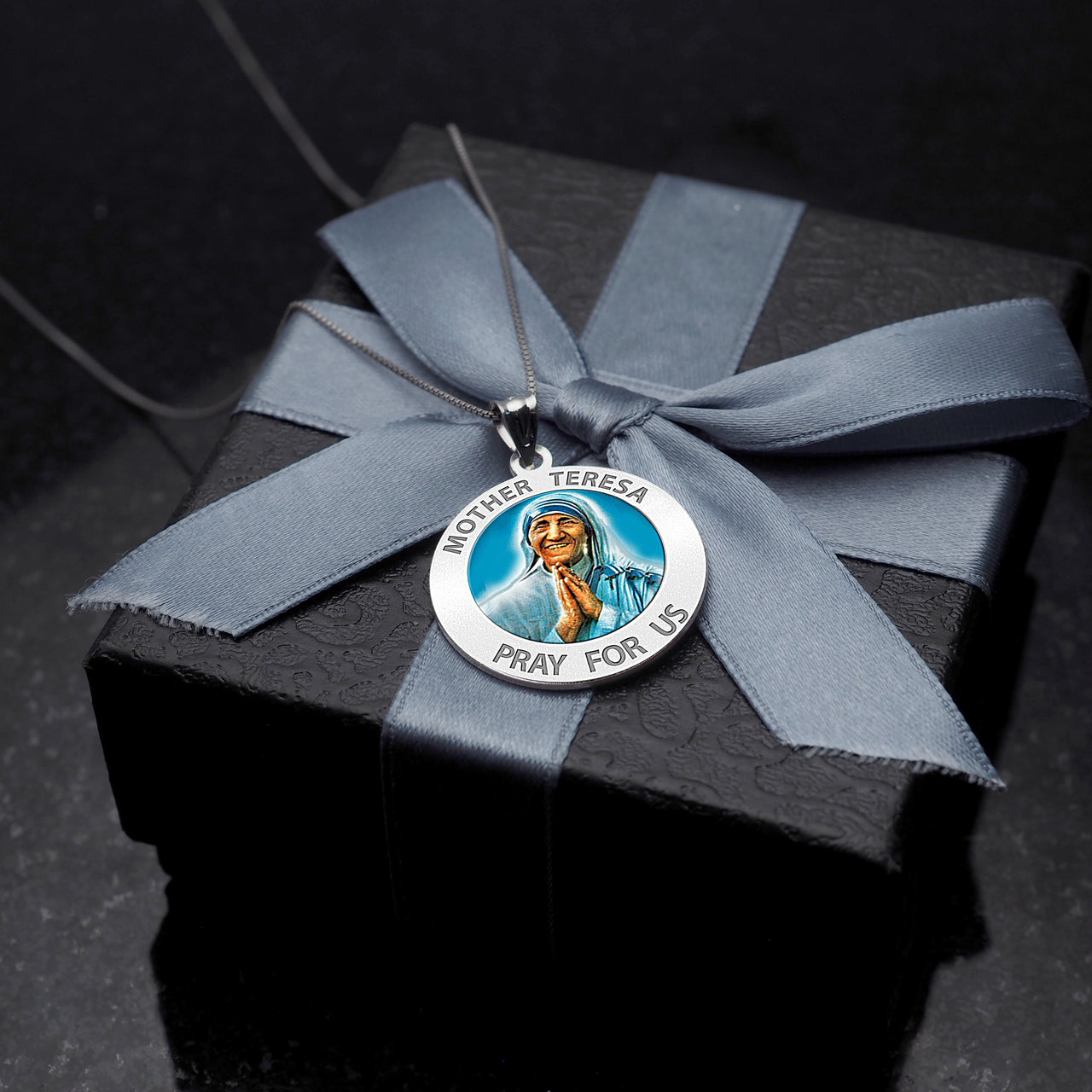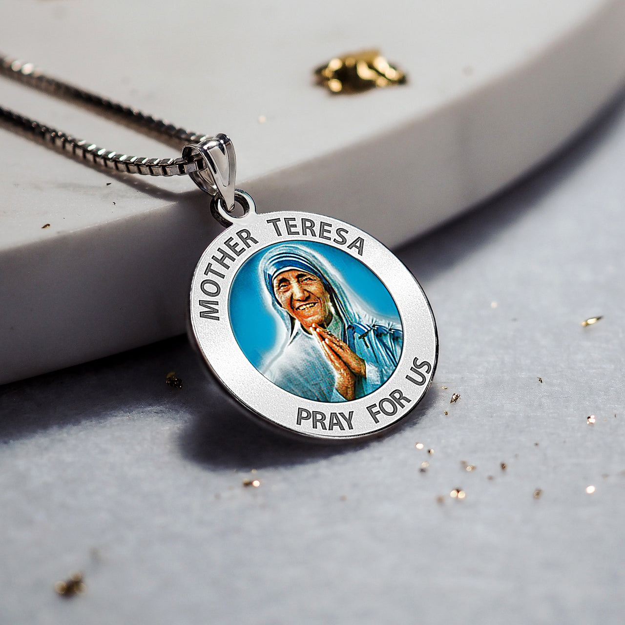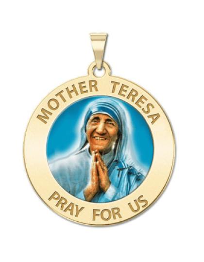 All Religious Medals are Customizable. We can change the spelling, your language, names etc, ex: change "Pray for Us" to "Pray For Me". Just let us know in "special instructions"Color Laser is a patent pending process, color is guaranteed to last foreverColor Medals can be worn in the pool, shower, etc. without affecting the image. We guarantee it.Mother Teresa (August 26, 1910 September 5, 1997) was an Indian Roman Catholic nun of Albanian ethnicity who founded the Missionaries of Charity and won the Nobel Peace Prize in 1979 for her humanitarian work. For over forty years she ministered to the poor, sick, orphaned, and dying in Kolkata (Calcutta), India.