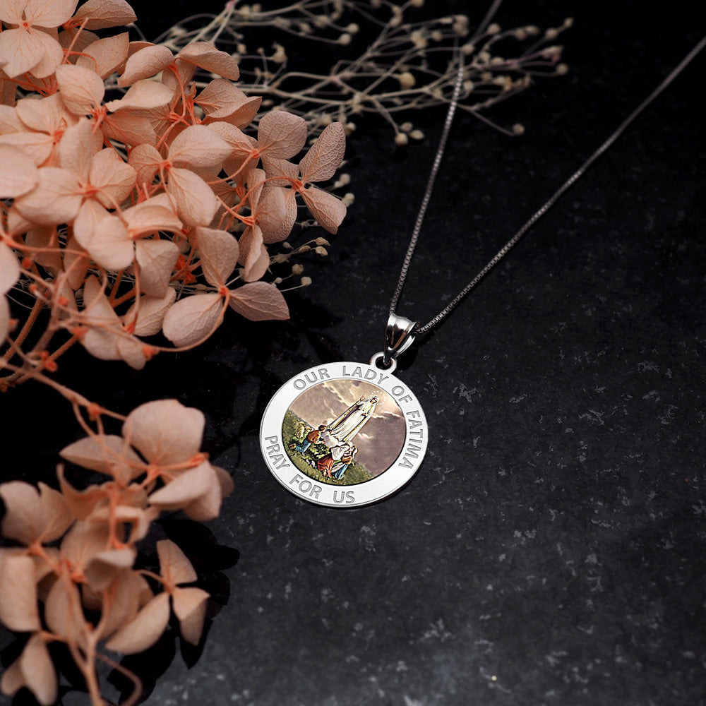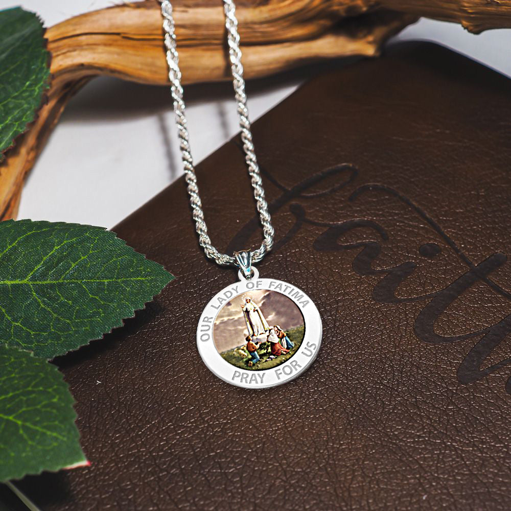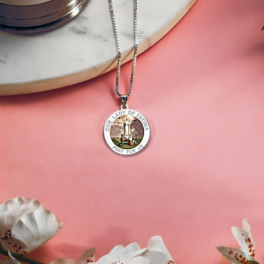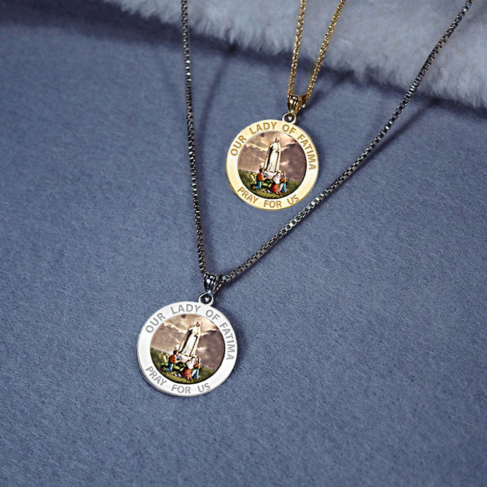 All Religious Medals are Customizable. We can change the spelling, your language, names etc, ex: change "Pray for Us" to "Pray For Me". Just let us know in "special instructions"Color Laser is a patent pending process, color is guaranteed to last foreverColor Medals can be worn in the pool, shower, etc. without affecting the image. We guarantee it.Our Lady of Ftima (pronounced [fatim]) is the title given to the Blessed Virgin Mary by those who believe that she appeared to three shepherd children at Ftima, Portugal on the 13th day of six consecutive months in 1917, starting on 13 May, the Ftima holiday. The three children were Lcia dos Santos and siblings Francisco and Jacinta Marto. The title of Our Lady of the Rosary is also sometimes used in reference to the same apparition (although it was first used in 1208 for the reported apparition in the church of Prouille); because the children related that the Lady in the apparition specifically identified Herself as "the Lady of the Rosary." It is also common to see a combination of these titles, i.e., Our Lady of the Rosary of Ftima