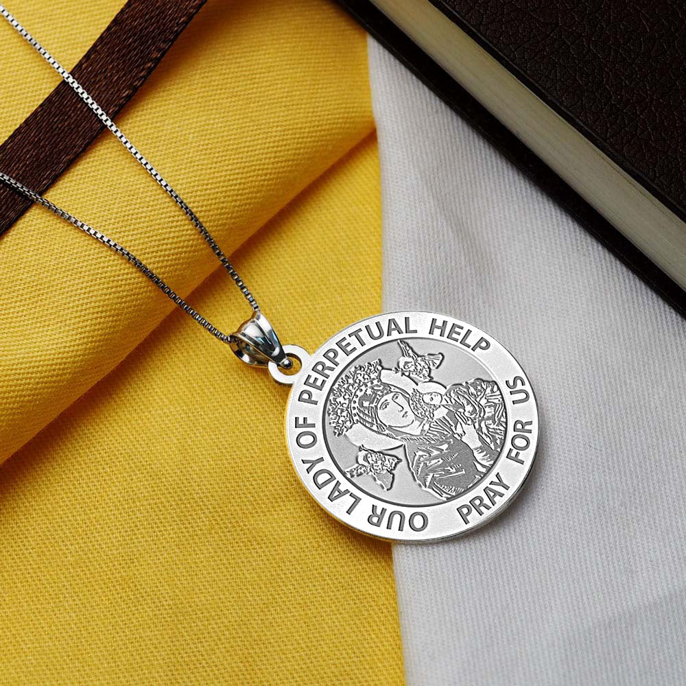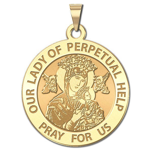 All Religious Medals are Customizable. We can change the spelling, your language, names etc, ex: change "Pray for Us" to "Pray For Me". Just let us know in "special instructions"Our Mother of Perpetual Help (or of Succour) or Our Lady of Perpetual Help is a title given to the Blessed Virgin Mary, associated with a Byzantine icon of the same name, said to be 13th or 14th century, but perhaps 15th century, which has been in Rome since at least the late 15th century. The image is very popular among Catholics in particular, and has been much copied and reproduced. In the Eastern Orthodox Church this iconography is known as the Theokotos of the Passion. On the left is the archangel Michael, carrying the lance and sponge as instruments of Jesus Christ's crucifixion. On the right is the archangel Gabriel carrying a 3-bar cross and nails. This type of icon is a later type of the Hodegetria composition, where Mary is pointing to her Son, known as a Theokotos of the Passion. The Christ-child has been alarmed by a pre-sentiment of his Passion, and has run to his mother for comfort. The facial expression of the Virgin Mary is solemn and is looking directly at the viewer instead of her son. The Greek initials on top read Mother of God, Michael Archangel, Gabriel Archangel, and Jesus Christ, respectively. Jesus is portrayed clinging to his mother with a dangling sandal.