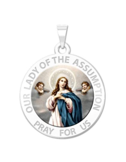 All Religious Medals are Customizable. We can change the spelling, your language, names etc, ex: change "Pray for Us" to "Pray For Me". Just let us know in "special instructions"Color Laser is a patent pending process, color is guaranteed to last foreverColor Medals can be worn in the pool, shower, etc. without affecting the image. We guarantee it.According to Roman Catholic theology and Catechism, the Virgin Mary, "having completed the course of her earthly life, was assumed body and soul into heavenly glory." This means that Mary was transported into Heaven with her body and soul united. The feast day recognizing Mary's passage into Heaven is celebrated as The Solemnity of the Assumption of the Blessed Virgin Mary by Roman Catholics. This doctrine was dogmatically and infallibly defined by Pope Pius XII on 1 November 1950 in his Apostolic Constitution Munificentissimus Deus. In those denominations that observe it, the Assumption is commonly celebrated on August 15. In his August 15, 2004 homily given at Lourdes, Pope John Paul II quoted John 14:3 from the Bible as a scriptural basis for understanding the dogma of the Assumption of Mary, where Christ, in his Last Supper discourses, explained that "When I go and prepare a place for you, I will come again and will take you to myself, that where I am, there you may be also". Mary is the pledge of the fulfillment of Christ's promise.