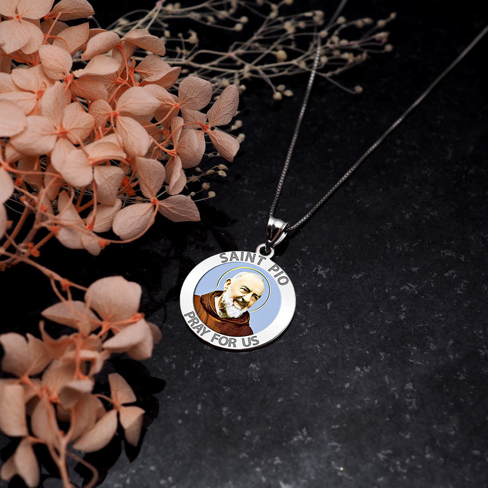 All Religious Medals are Customizable. We can change the spelling, your language, names etc, ex: change "Pray for Us" to "Pray For Me". Just let us know in "special instructions"Color Laser is a patent pending process, color is guaranteed to last foreverColor Medals can be worn in the pool, shower, etc. without affecting the image. We guarantee it.Padre Pio was an Italian Roman Catholic priest who is now venerated as a saint in the Roman Catholic Church. He was given the name Pio when he joined the Order of Friars Minor Capuchin, and was popularly known as Padre Pio after his ordination to the priesthood. He became famous for his piety.