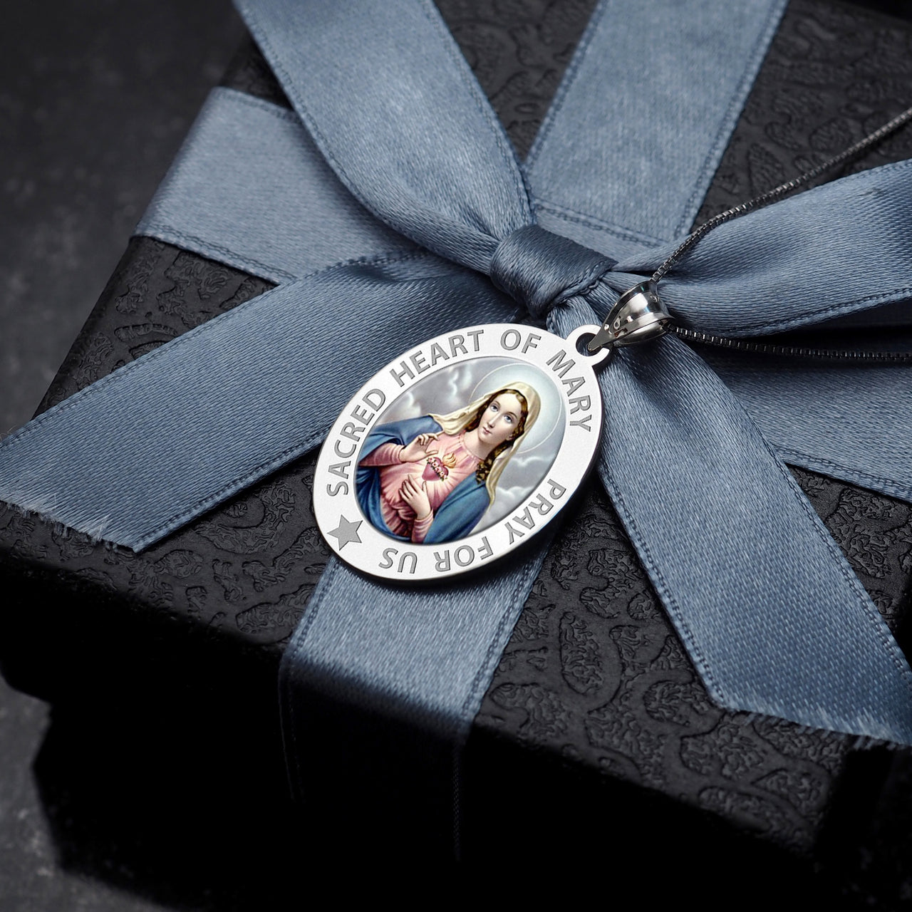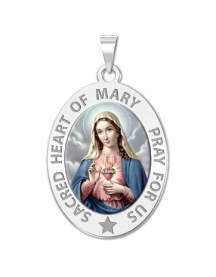 All Religious Medals are Customizable. We can change the spelling, your language, names etc, ex: change ("Pray for Us" to "Pray For Me") or ("Saced Heart of Mary" to "Immaculate Heart of Mary"). Just let us know in "special instructions"Color Laser is a patent pending process, color is guaranteed to last foreverColor Medals can be worn in the pool, shower, etc. without affecting the image. We guarantee it.The Sacred Heart of Mary is a devotional name used by Roman Catholics and some Anglicans to refer to the physical heart of Mary, the mother of Jesus as a symbol of Mary's interior life, her joys and sorrows, her virtues and hidden perfections, and, above all, her virginal love for her God, her maternal love for her Son, Jesus, and her compassionate love for all people. The consideration of Mary's interior life and the beauties of her soul, without any thought of her physical heart, does not constitute the traditional devotion; still less does it consist in the consideration of the Heart of Mary merely as a part of her virginal body. The two elements are essential to the devotion, just as, according to Roman Catholic theology, soul and body are necessary to the constitution of man. Eastern Catholics generally do not utilize the image, devotion or theology associated with the Immaculate Heart of Mary, seeing it as a form of liturgical latinization. The Roman Catholic view is based on the Roman Catholic focus on Mariology, as exemplified by Pope John Paul II's Apostolic Letter Rosarium Virginis Mariae[1] which builds on the total Marian devotion pioneered by Saint Louis de Montfort. Traditionally, the heart is pierced with seven wounds or swords, in homage to the seven dolors of Mary. Consequently, seven Hail Marys are said daily in honor of the devotion. If you'd like for the medal to read "Immacu