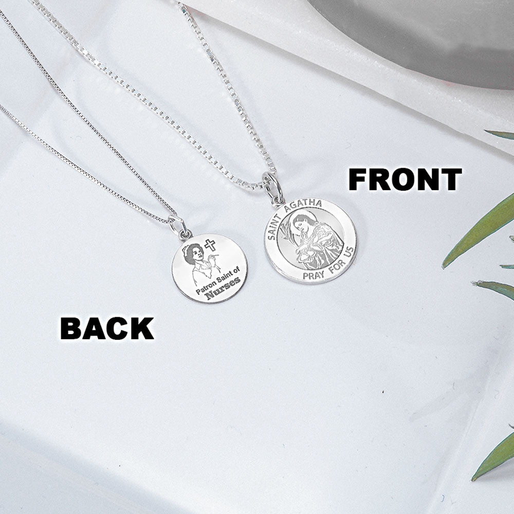 All Religious Medals are Customizable. We can change the spelling, your language, names etc, ex: change "Pray for Us" to "Pray For Me". Just let us know in "special instructions"Buy any Give Pink Collection item during October and we'll donate 50 of the profits to the American Breast Cancer FoundationSaint Agatha of Sicily (d. 251) is a Christian saint. Her memorial is on 5 February. Agatha was born at Catania and she was martyred in approximately AD 250. She is the patron saint of Catania. She is one of seven women, excluding the Blessed Virgin Mary, commemorated by name in the Canon of the Mass. According to variations of her legend, having rejected the amorous advances of a Roman prefect, she was persecuted by him for her Christian faith. Among the tortures she underwent was the cutting off of her breasts. She is therefore often depicted iconographically carrying her excised breasts on a platter. The shape of her amputated breasts, especially as depicted in artistic renderings, gave rise to her attribution as the patron saint of bell-founders and as the patron saint of bakers. More recently, she has been venerated as patron saint of breast cancer patients. Her scorned admirer eventually sentenced her to death by being burnt at the stake. However, she was saved from this fate by a mysterious earthquake. She later died in prison. She is considered as patron saint of Malta since her intercession is reported to have saved Malta from Turkish invasion in 1551. She is also patron saint of Breast Cancer, Breast Disorders, and Rape Victims. The memory of Agatha is upheld in particular by the Military Order of the Collar of Saint Agatha of Patern.
