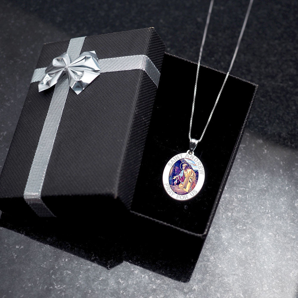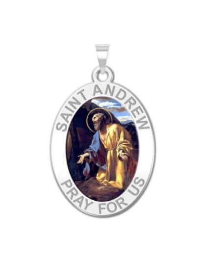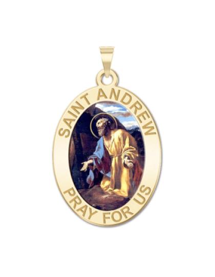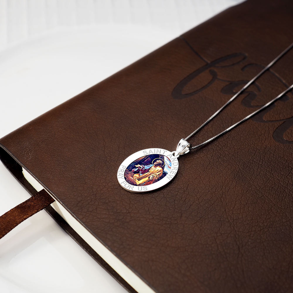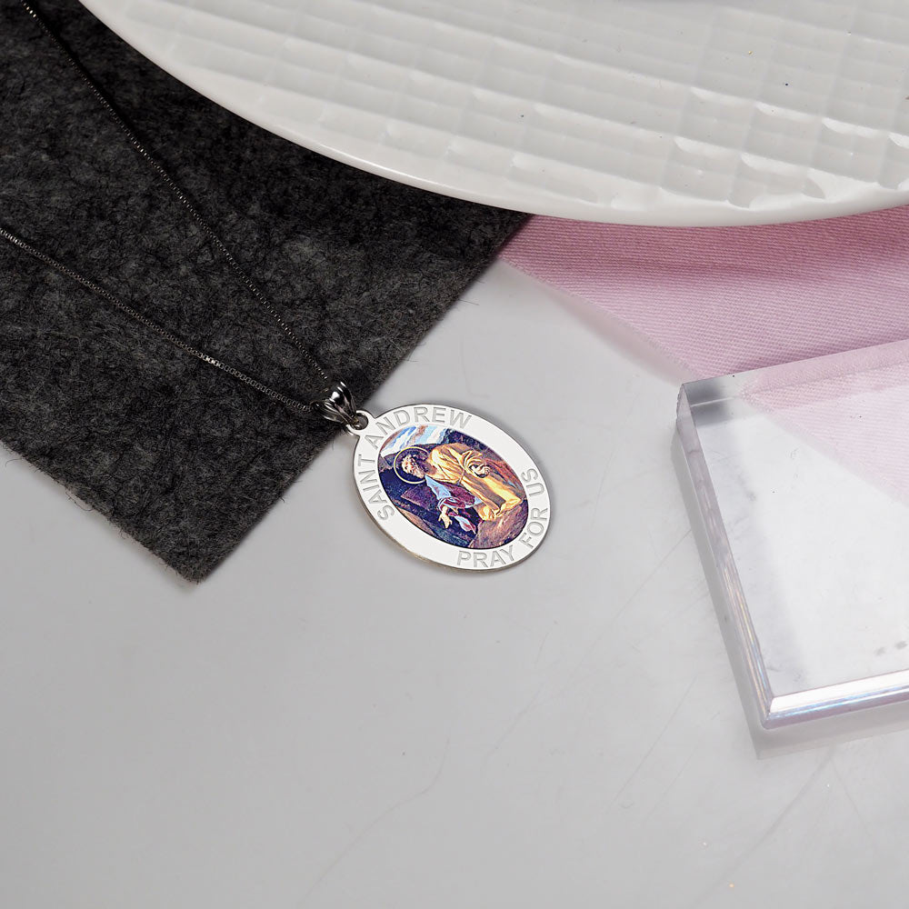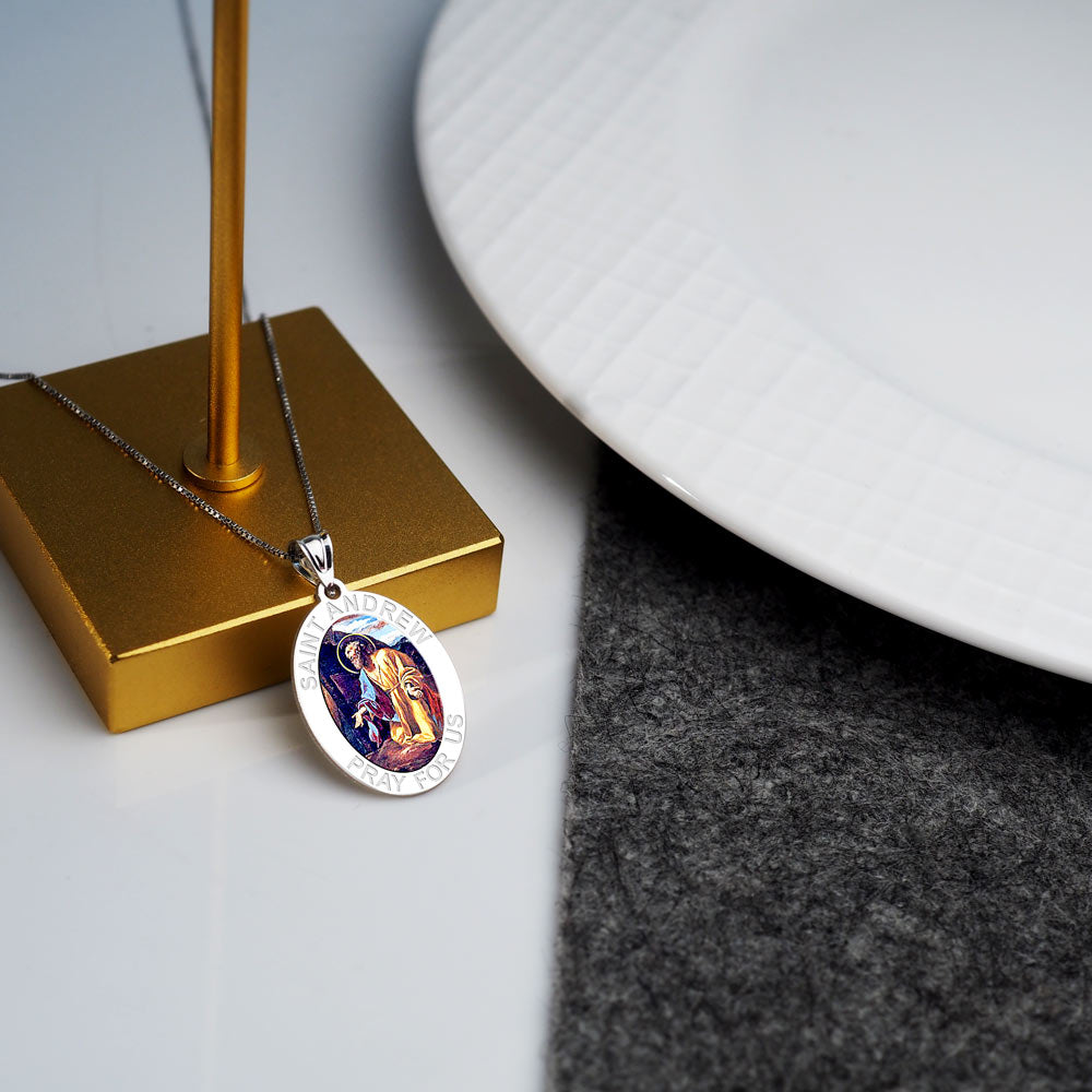 All Religious Medals are Customizable. We can change the spelling, your language, names etc, ex: change "Pray for Us" to "Pray For Me". Just let us know in "special instructions"Color Laser is a patent pending process, color is guaranteed to last foreverColor Medals can be worn in the pool, shower, etc. without affecting the image. We guarantee it.The New Testament records that St Andrew was a son of Jonah, or John. He was born in Bethsaida on the Sea of Galilee. Both he and his brother Peter were fishermen by trade, hence the tradition that Jesus called them to be his disciples by saying that He will make them "fishers of men." At the beginning of Jesus' public life they occupied the same house at Capernaum. The Gospel of John teaches that Andrew was a disciple of John the Baptist, whose testimony first led him and John the Evangelist to follow Jesus. Andrew at once recognized Jesus as the Messiah, and hastened to introduce him to his brother. Thenceforth the two brothers were disciples of Christ. On a subsequent occasion, prior to the final call to the apostolate, they were called to a closer companionship, and then they left all things to follow Jesus. In the gospels Andrew is referred to as being present on some important occasions as one of the disciples more closely attached to Jesus, but in Acts there is only a bare mention of him. Andrew is said to have been martyred by crucifixion at Patras (Patrae) in Achaea. Though early texts, such as the Acts of Andrew known to Gregory of Tours, describe Andrew bound, not nailed, to a Latin cross of the kind on which Christ was crucified, a tradition grew up that Andrew had been crucified on a cross of the form called Crux decussata (X-shaped cross) and commonly known as "St. Andrew's cross"; this was performed at his own request, as he deemed himself