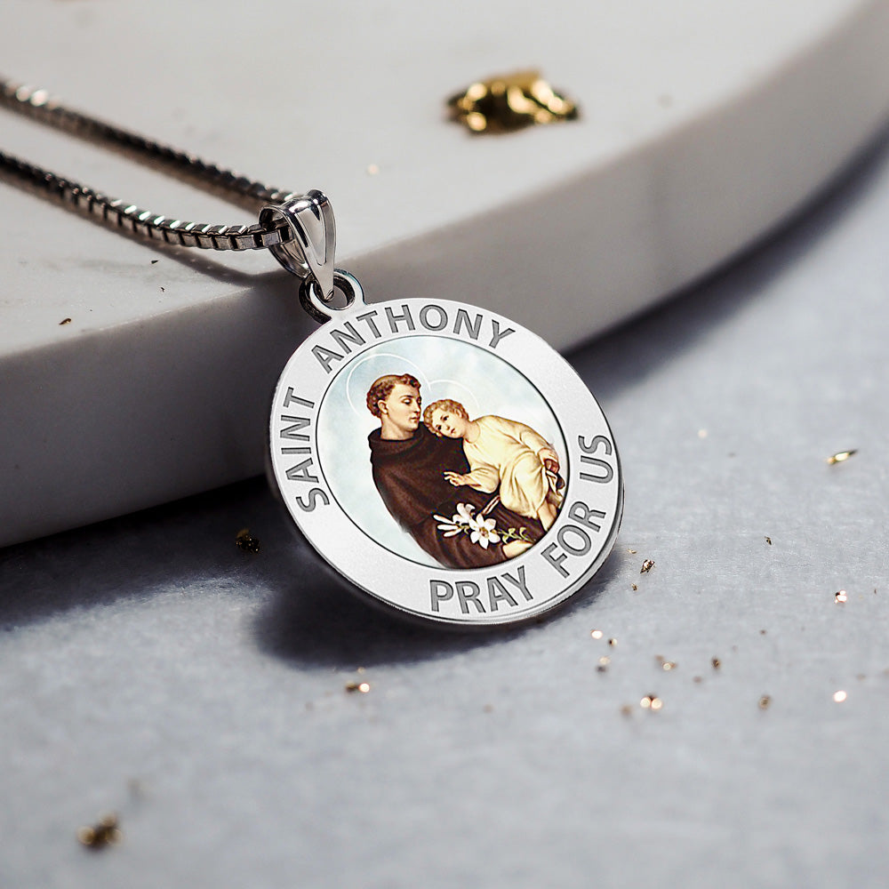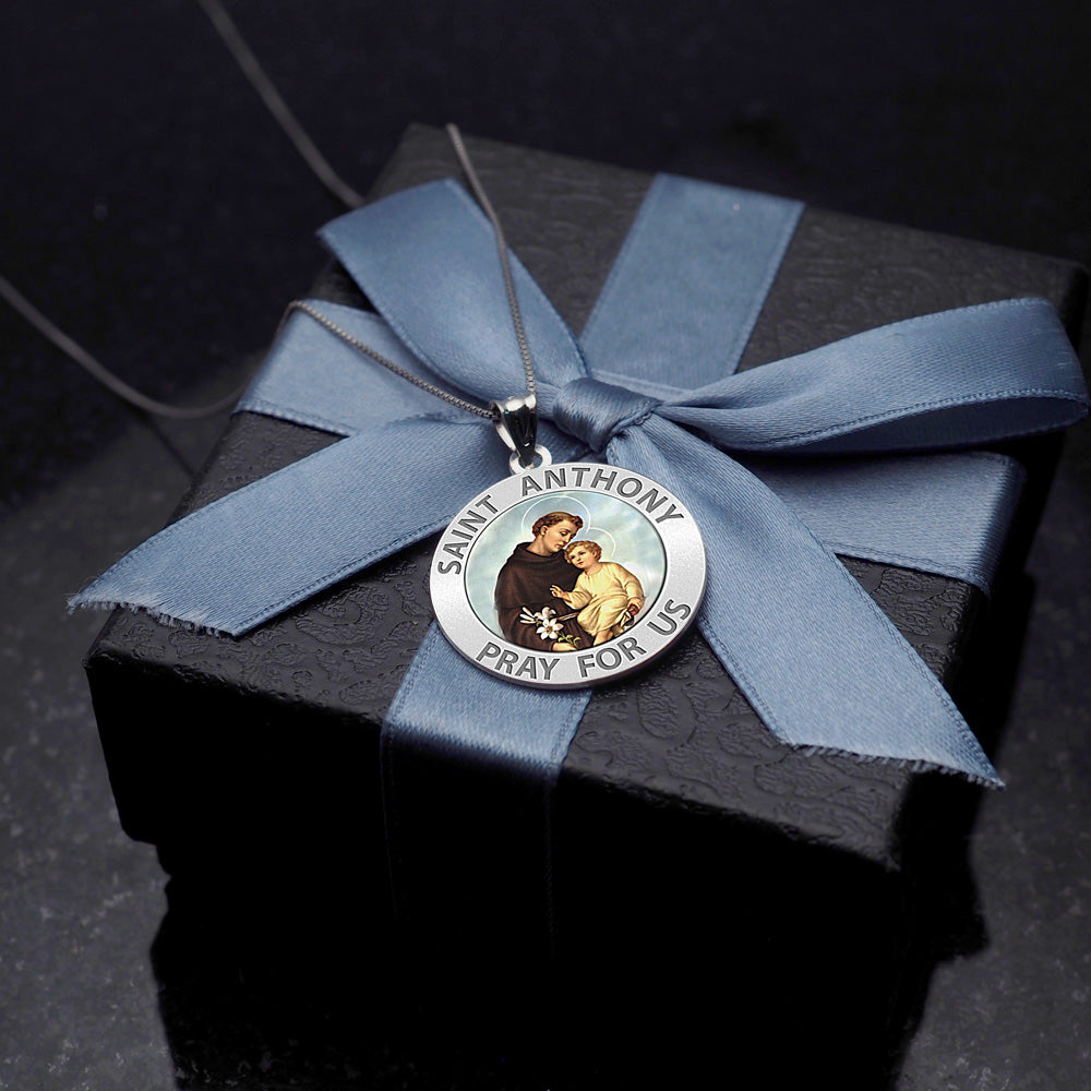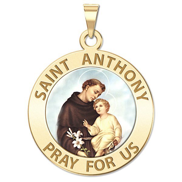 All Religious Medals are Customizable. We can change the spelling, your language, names etc, ex: change "Pray for Us" to "Pray For Me". Just let us know in "special instructions"Color Laser is a patent pending process, color is guaranteed to last foreverColor Medals can be worn in the pool, shower, etc. without affecting the image. We guarantee it.One of the most beloved of saints. His images and statues are ubiquitous. Proclaimed a Doctor of the Church on January 16, 1946, he is sometimes called "Evangelical Doctor". He is especially invoked for the recovery of things lost ("Saint Anthony, Saint Anthony, please come around. Something is lost and cannot be found."). On January 27, 1907 in Beaumont, Texas, a church was dedicated and named in honor of St. Anthony of Padua. The church was later designated a cathedral in 1966 with the formation of the Roman Catholic Diocese of Beaumont, but was not formally consecrated. On April 28, 1974, St Anthony Cathedral was dedicated and consecrated by Bishop Warren Boudreaux. In 2006 Pope Benedict XVI granted St. Anthony Cathedral the designation of minor basilica. St. Anthony Cathedral Basilica celebrated its 100th anniversary on January 28, 2007. Seventeenth century Spanish missionaries came across a small Native American community along what was then known as the Yanaguana River on the feast day of Saint Anthony and renamed the river and eventually a mission built nearby in his honor. This mission would at first become the focal point of a small community that would eventually grow in size and scope to become the city of San Antonio.
